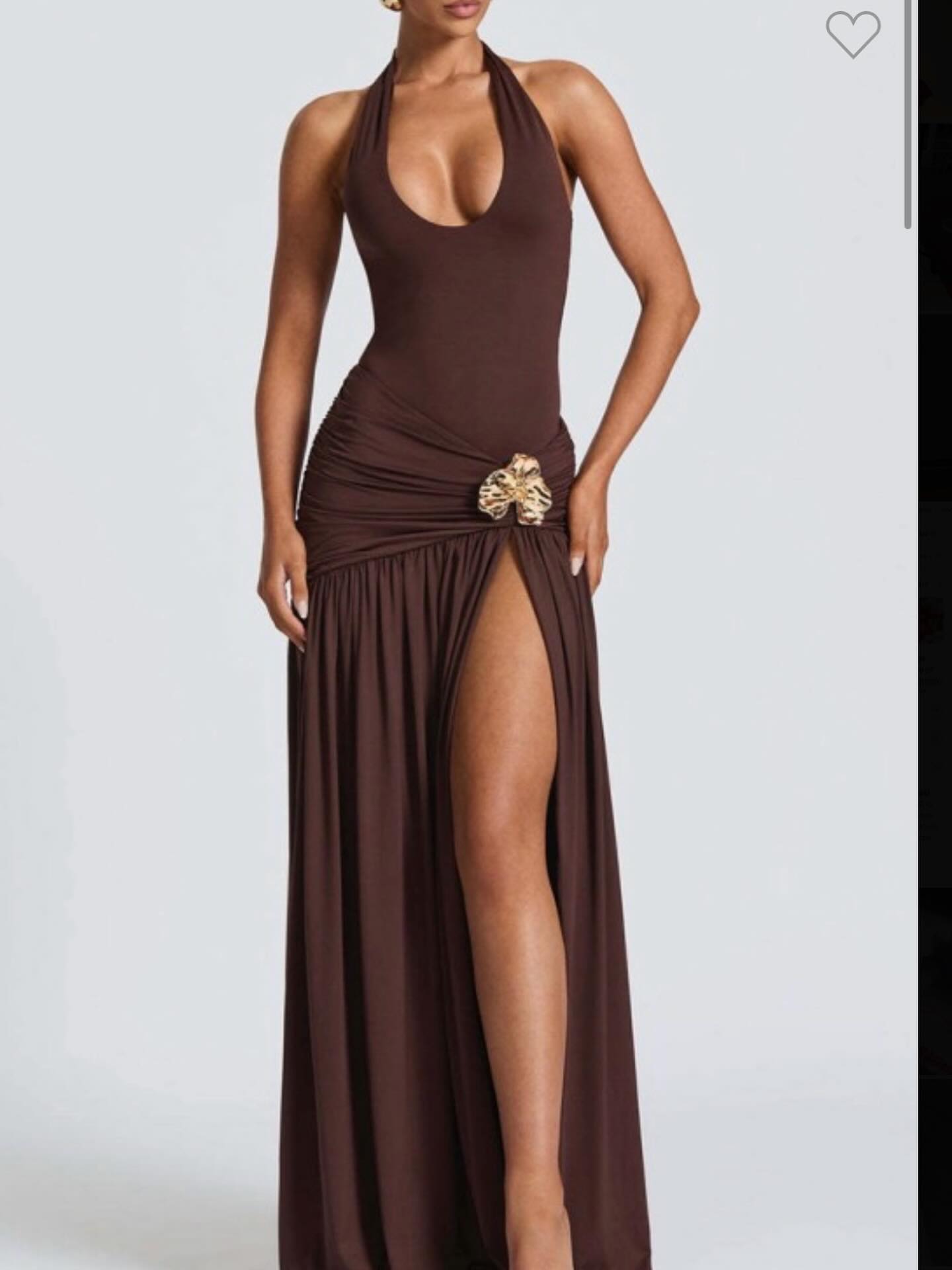 This elegant brown women’s halter maxi dress features a fitted bodice and a flowing skirt with a high slit, accentuated by a decorative detail at the waist. Perfect for formal occasions, the dress offers a stylish and sophisticated look.