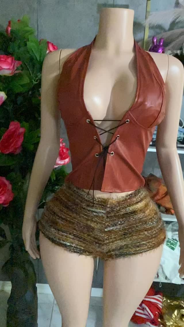 This outfit features a brown lace-up top with a halter neck design and coordinating textured brown shorts. The ensemble is stylish and perfect for casual outings or a unique fashion statement.