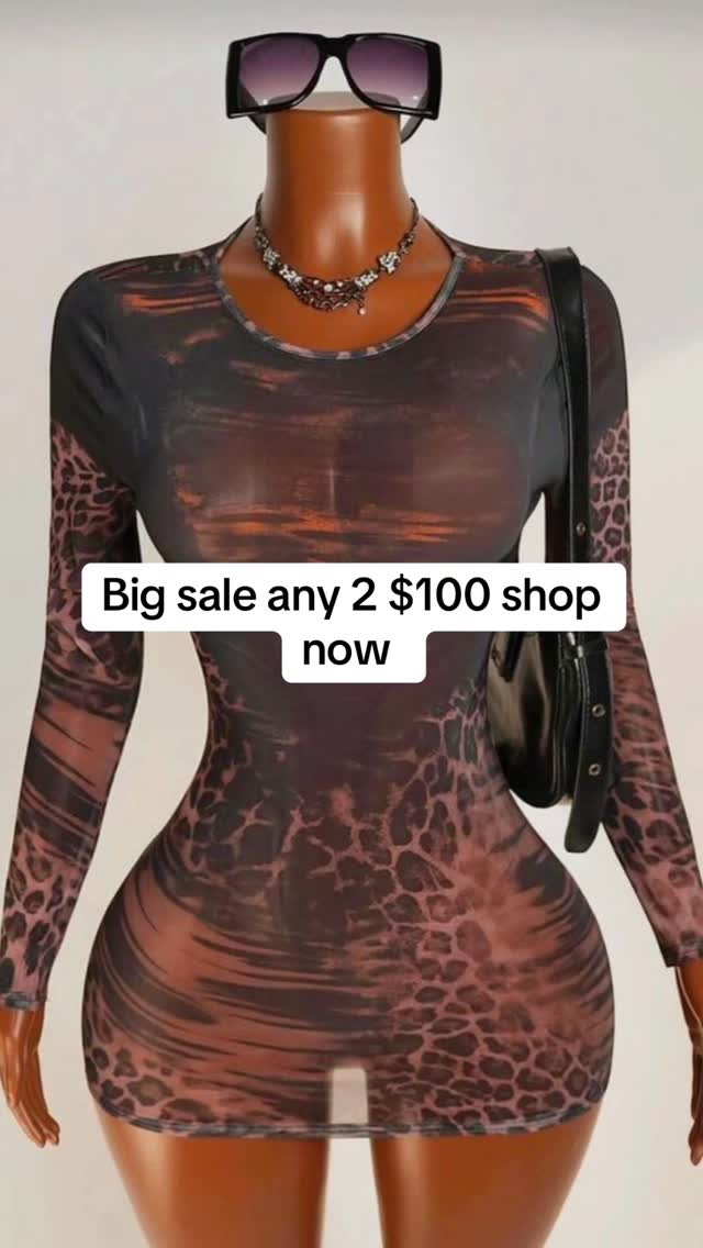 A stylish women’s bodycon dress featuring a mix of brown and black animal print pattern. This dress has long sleeves and a form-fitting silhouette, making it a chic choice for casual outings or parties.