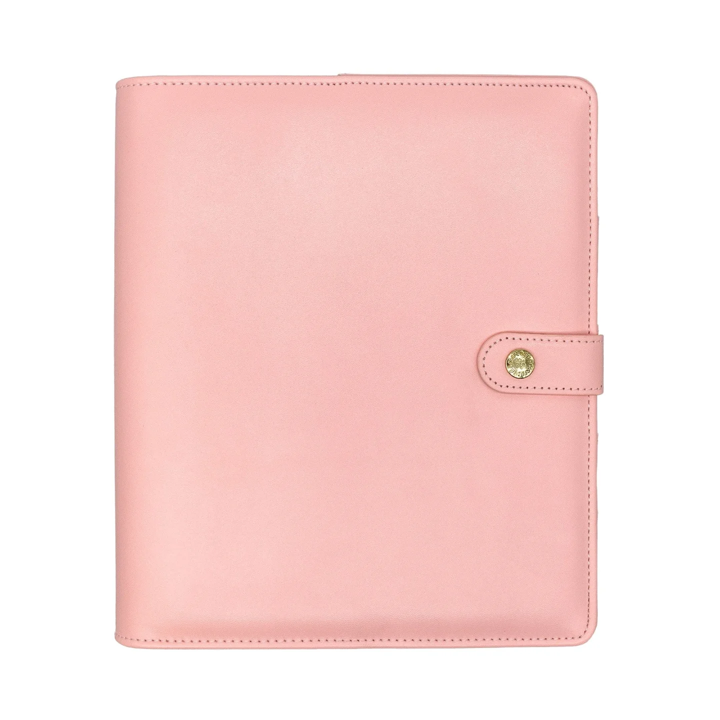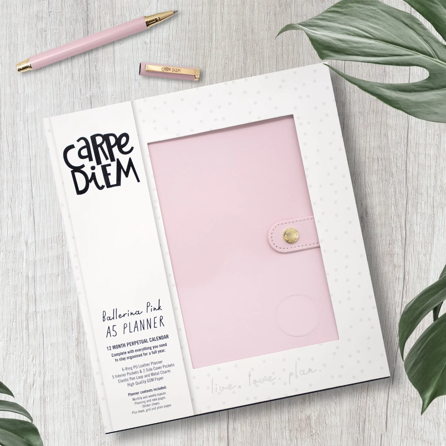 This Carpe Diem Ballerina Pink A5 planner box set features a faux leather 6-ring binder with an elastic pen loop and multiple interior and side pockets. It includes undated monthly and weekly inserts, tabbed dividers, dashboard inserts, and three sticker sheets, providing a complete system for organizing busy schedules.