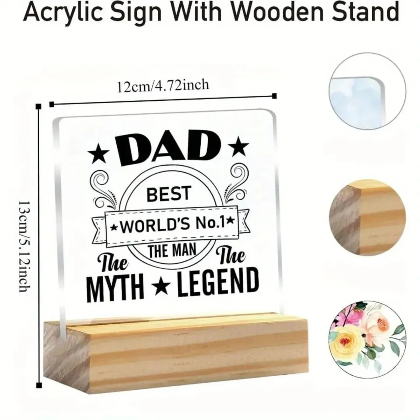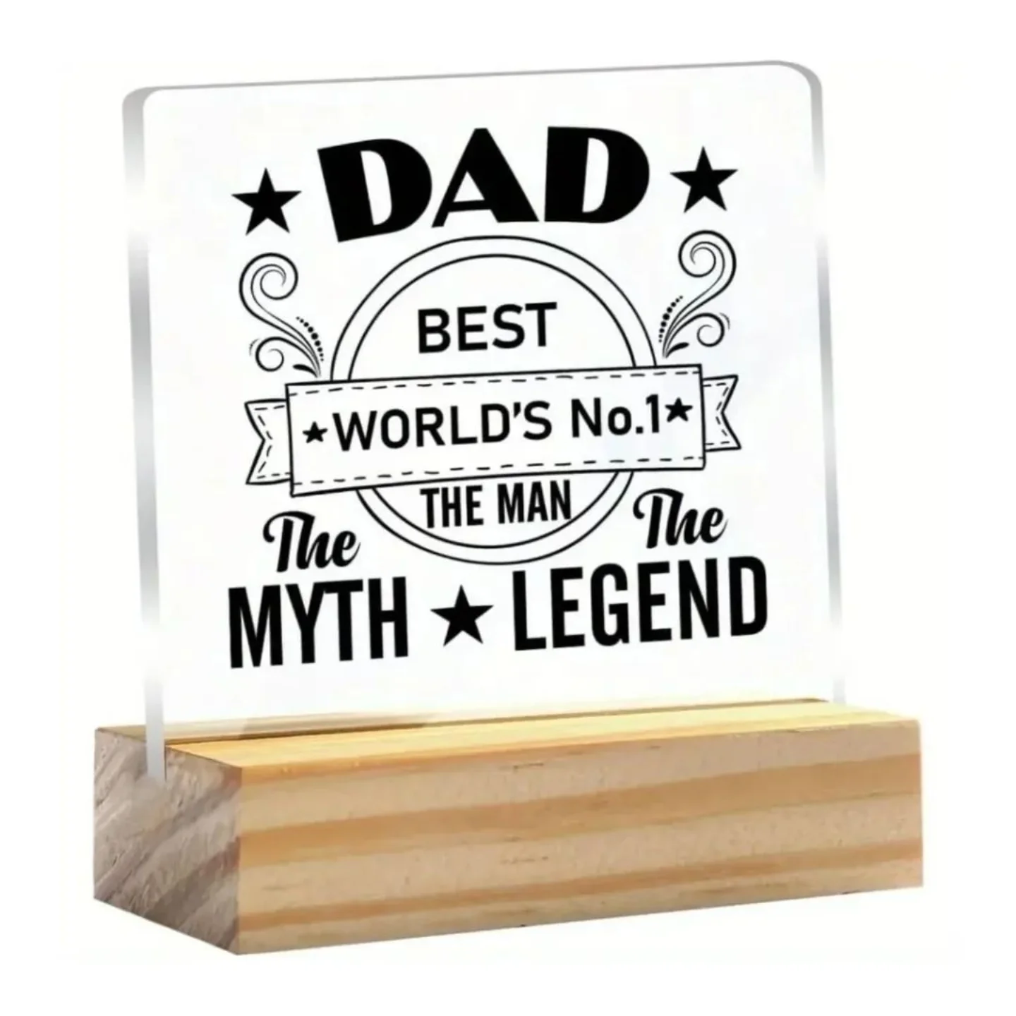 A clear acrylic gift plaque featuring the bold text ‘DAD BEST WORLD’S No.1 THE MAN THE MYTH THE LEGEND’, securely set on a natural wooden stand. This thoughtful and commemorative item, measuring 5.1″x4.72″, makes an ideal gift for dads on Father’s Day, birthdays, or any special occasion.