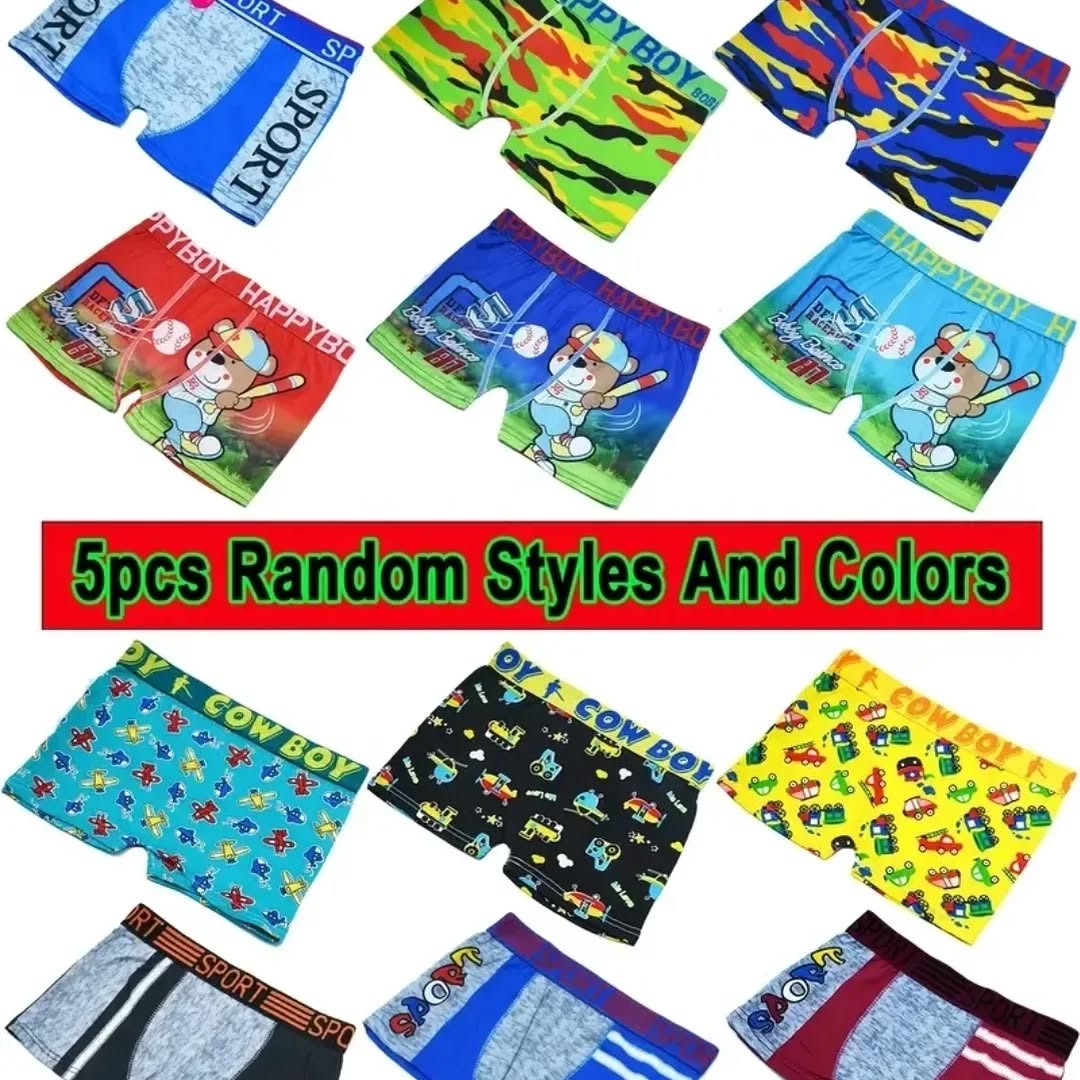 This set includes boys’ undergarments featuring various vibrant and playful prints. Each pair boasts a unique design with fun patterns, ensuring a comfortable fit with a high elastic waist. Perfect for adding a cheerful touch to daily wear.