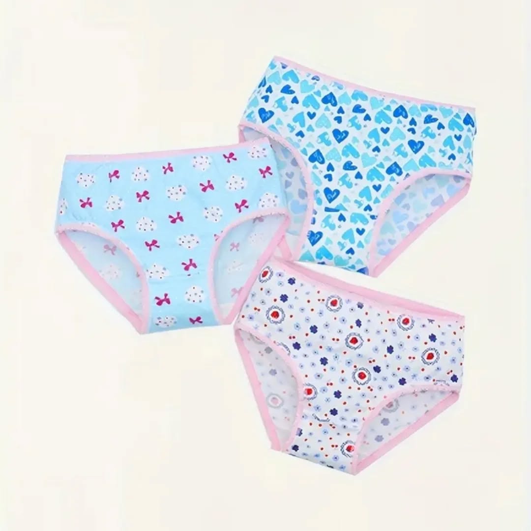 A set of vibrant girls’ undergarments featuring playful designs, ideal for everyday comfort. The set includes three pairs with different patterns: bows, hearts, and florals. Designed for girls aged 7-8 years.