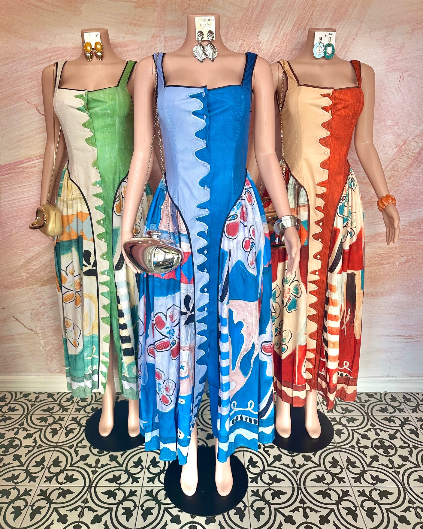 Vibrant women’s dresses featuring bold color combinations and artistic patterns. These dresses offer a stylish fit with spaghetti straps and a unique zigzag design along the front. Available in sizes S, M, and L, ideal for a fashionable look at any occasion.