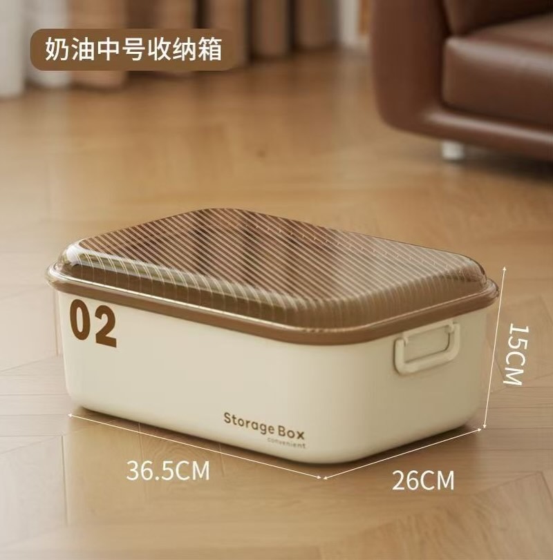 This cream-colored plastic storage box features a translucent brown ribbed lid and a sturdy base, ideal for organizing various items in your home or office. Measuring 36.5CM in length, 26CM in width, and 15CM in height, this medium-sized container offers a convenient solution for decluttering.