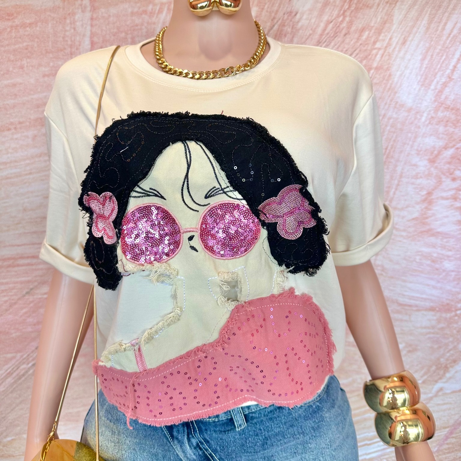 This women’s outfit features a cream graphic t-shirt adorned with a sequined design of a woman wearing pink sunglasses, paired with a light blue denim skort. The t-shirt is available in sizes M and L, while the skort comes in S, M, and L.