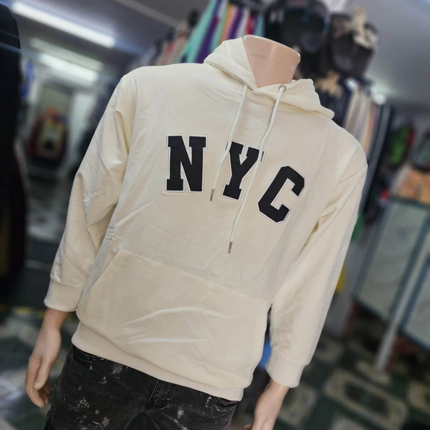 A cream-colored pullover hoodie featuring a bold ‘NYC’ graphic in black letters on the front. This hooded sweatshirt includes adjustable drawstrings and a practical kangaroo pocket, suitable for casual wear.