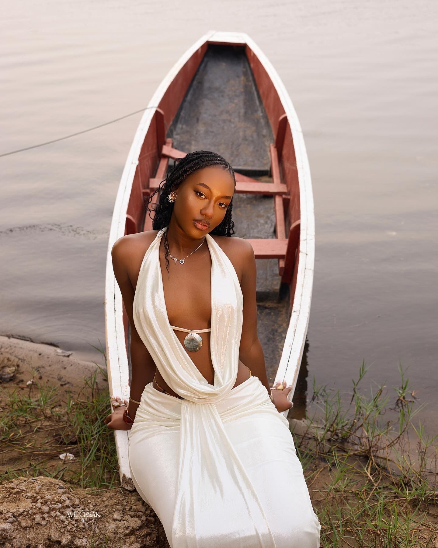 This elegant cream two-piece set features a draped cowl neck halter top and a matching high-waisted maxi skirt, crafted from a flowy fabric with a subtle sheen. Perfect for elevated moments, resort wear, or special occasions. Available in sizes S, M, L.