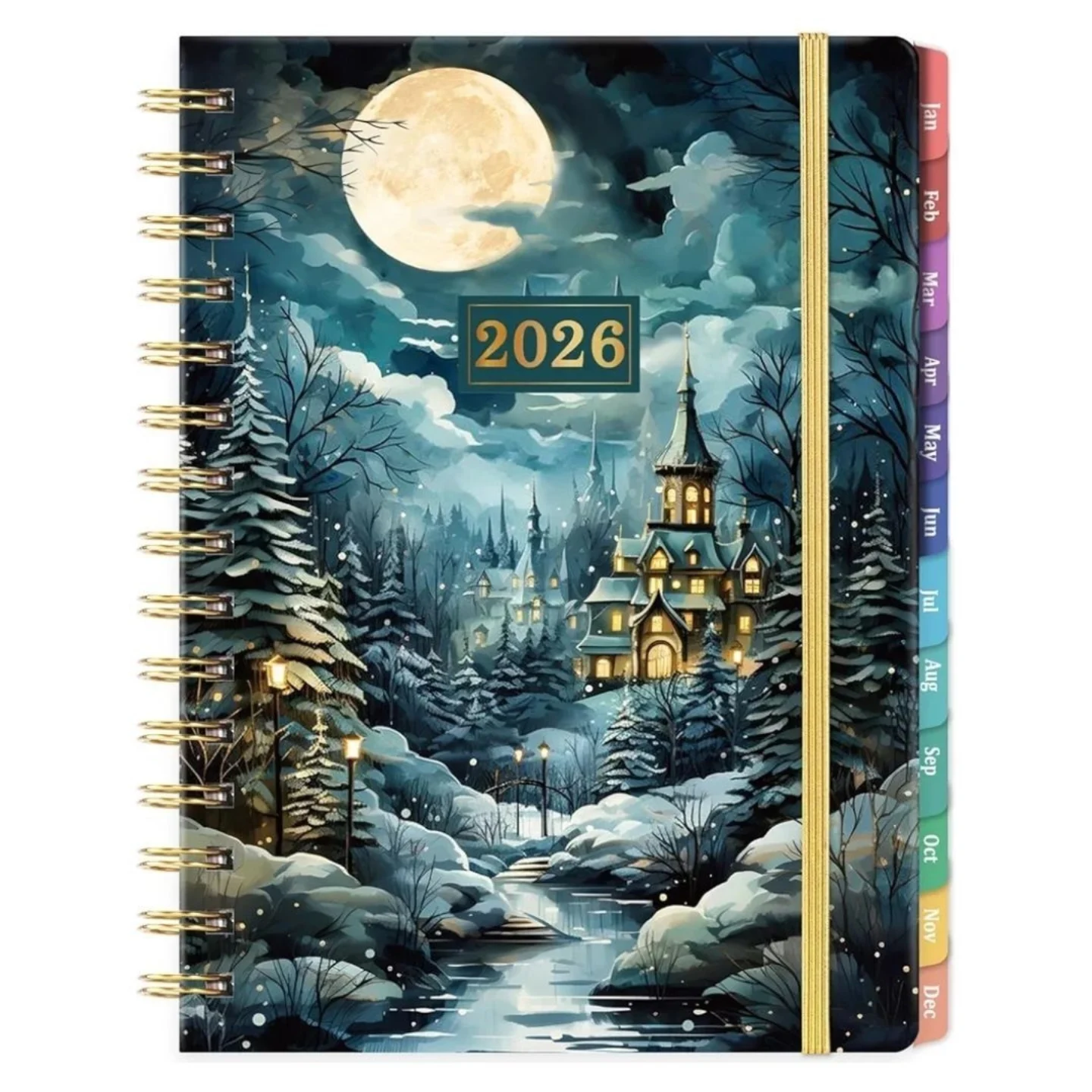 This 2026 weekly and monthly planner features a captivating vintage moon light castle pattern on a durable hardcover. Spanning from January to December 2026, it includes colorful monthly tabs, premium paper, twin-wire binding, an inner pocket, and an elastic closure. Measuring 6.3″ x 8.4″, it also offers contact pages, quick reference information, yearly overview, reference calendar, and holidays.