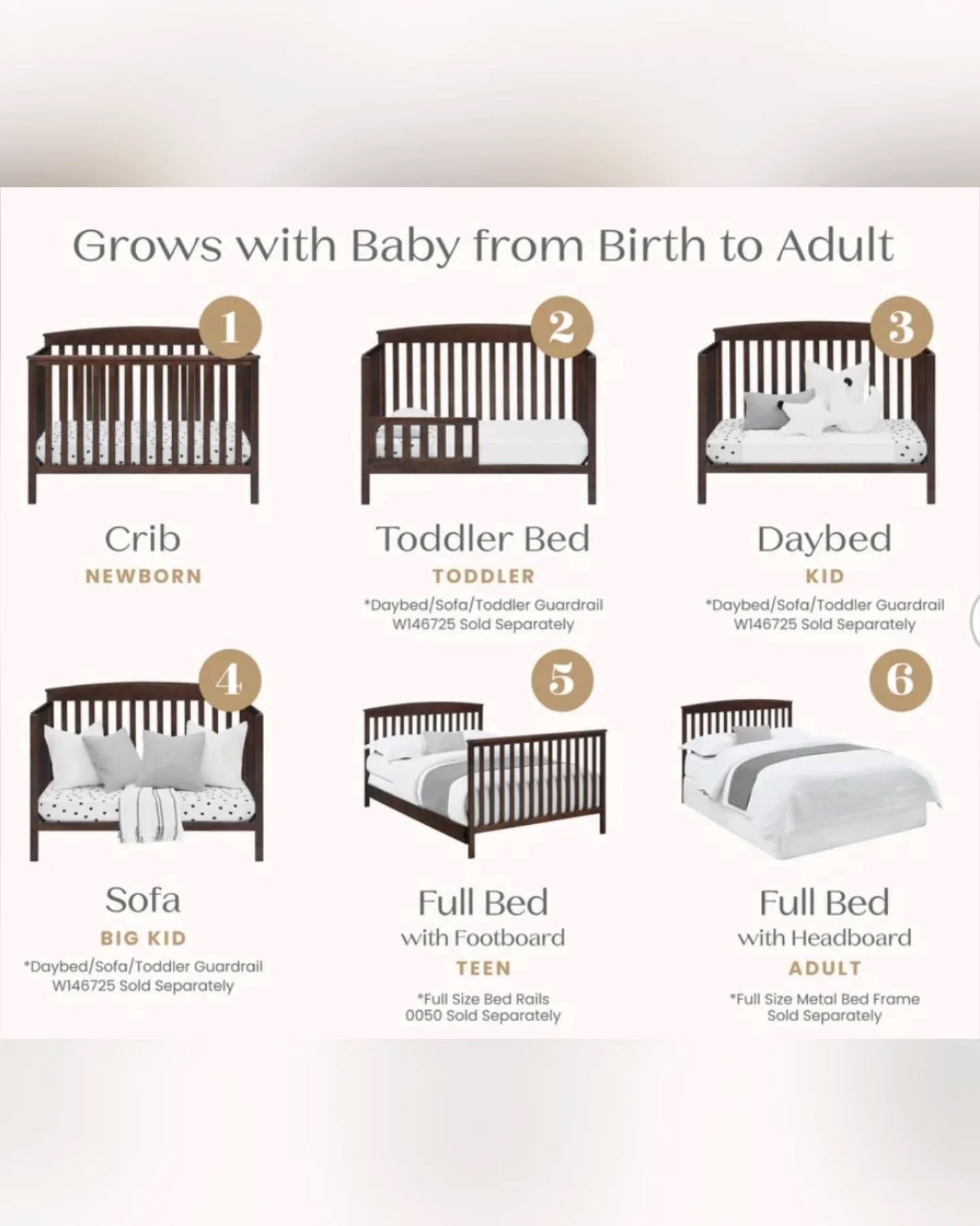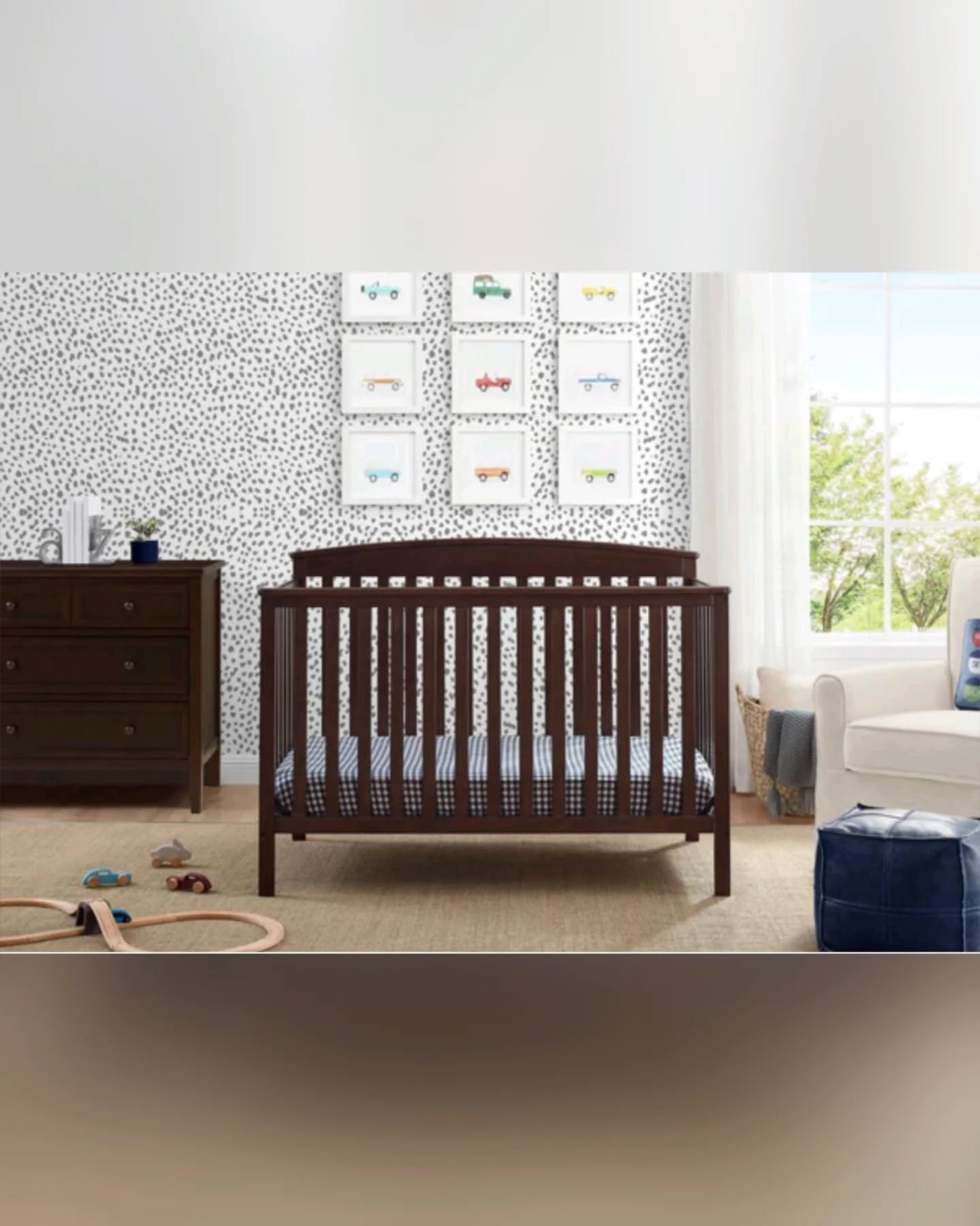 This Delta Children Hanover 6-in-1 Convertible Baby Crib is a timeless and sturdy nursery essential. It is designed to grow with your child, converting from a crib to a toddler bed, daybed, sofa, and full-size bed. The crib features an adjustable mattress height with 3 positions and a baby-safe, non-toxic finish. It is JPMA certified and meets/exceeds safety standards. Made from sustainable woods like New Zealand pine and poplar, it fits a standard crib mattress (sold separately). Conversion rails are sold separately.