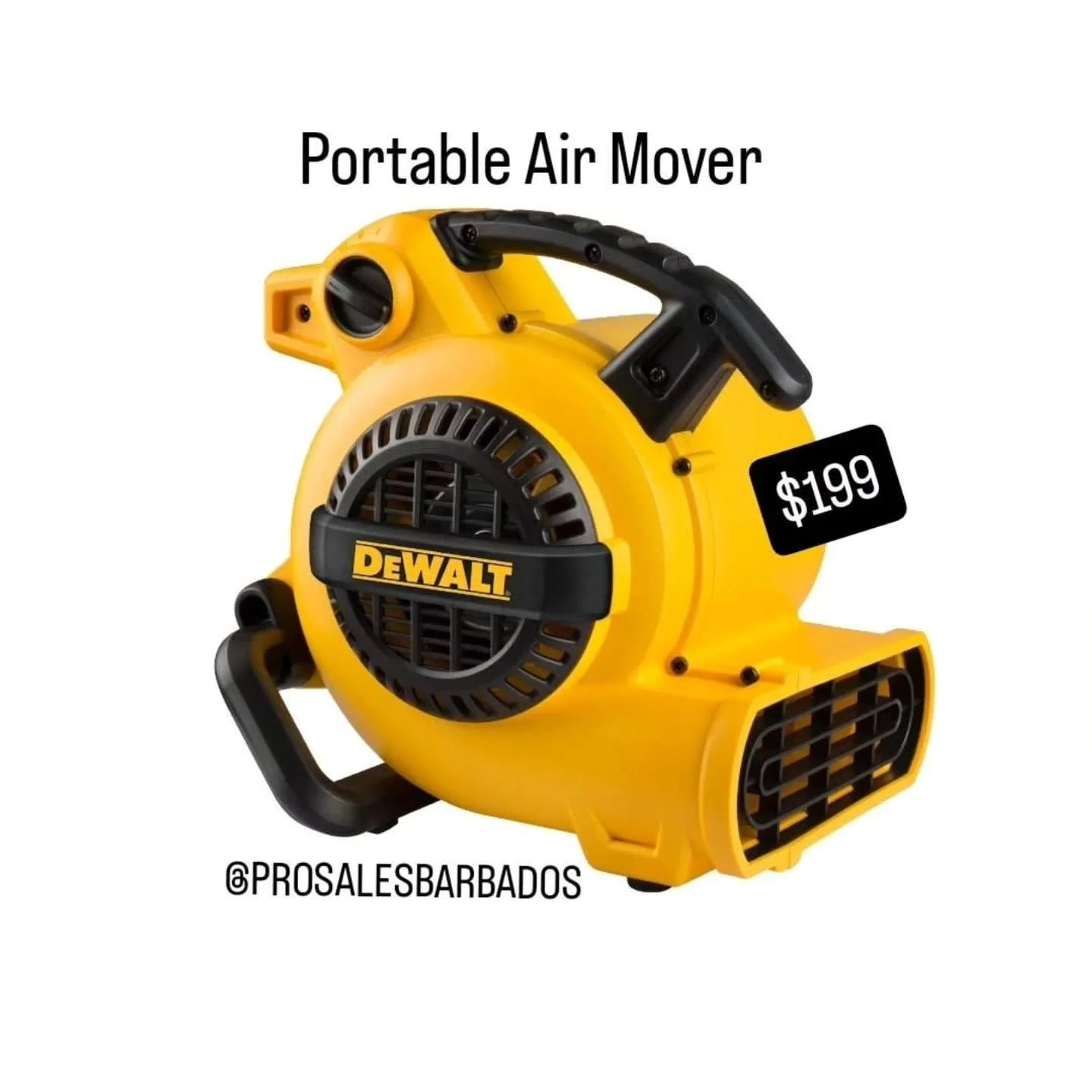 A yellow and black portable air mover from DEWALT, suitable for various air movement tasks.