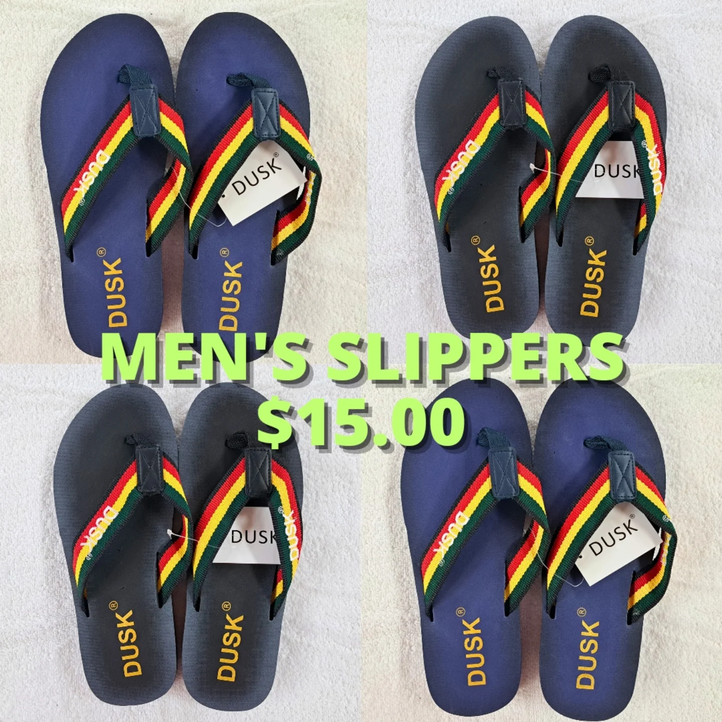 These DUSK men’s slippers feature comfortable soles and distinctive multi-colored striped straps in red, yellow, and green. Available in dark blue and dark grey, these flip-flops are perfect for casual wear.