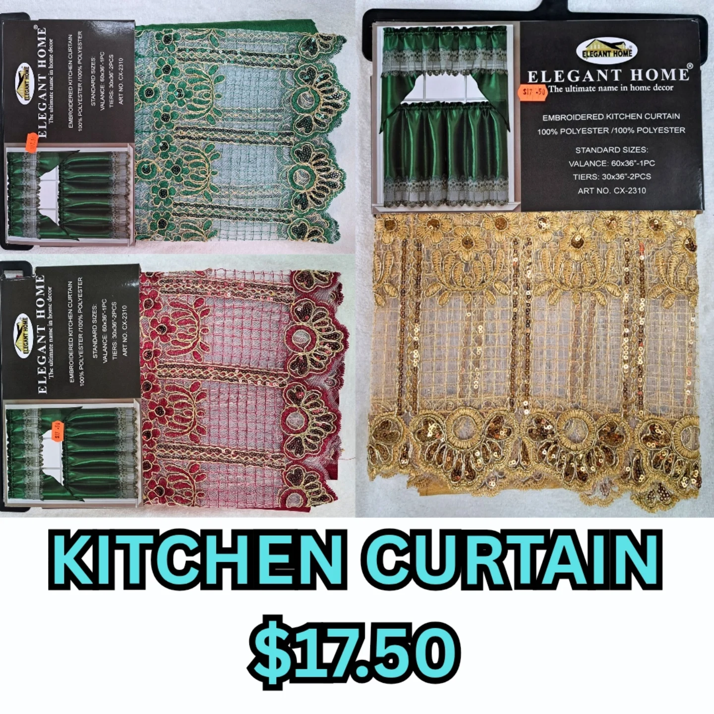 This Elegant Home embroidered kitchen curtain set, made from 100% polyester, adds a touch of elegance to any kitchen. Each set includes one valance (60×36″) and two tiers (30×36″), featuring intricate embroidery and sequin details. Available in green, red, and gold.