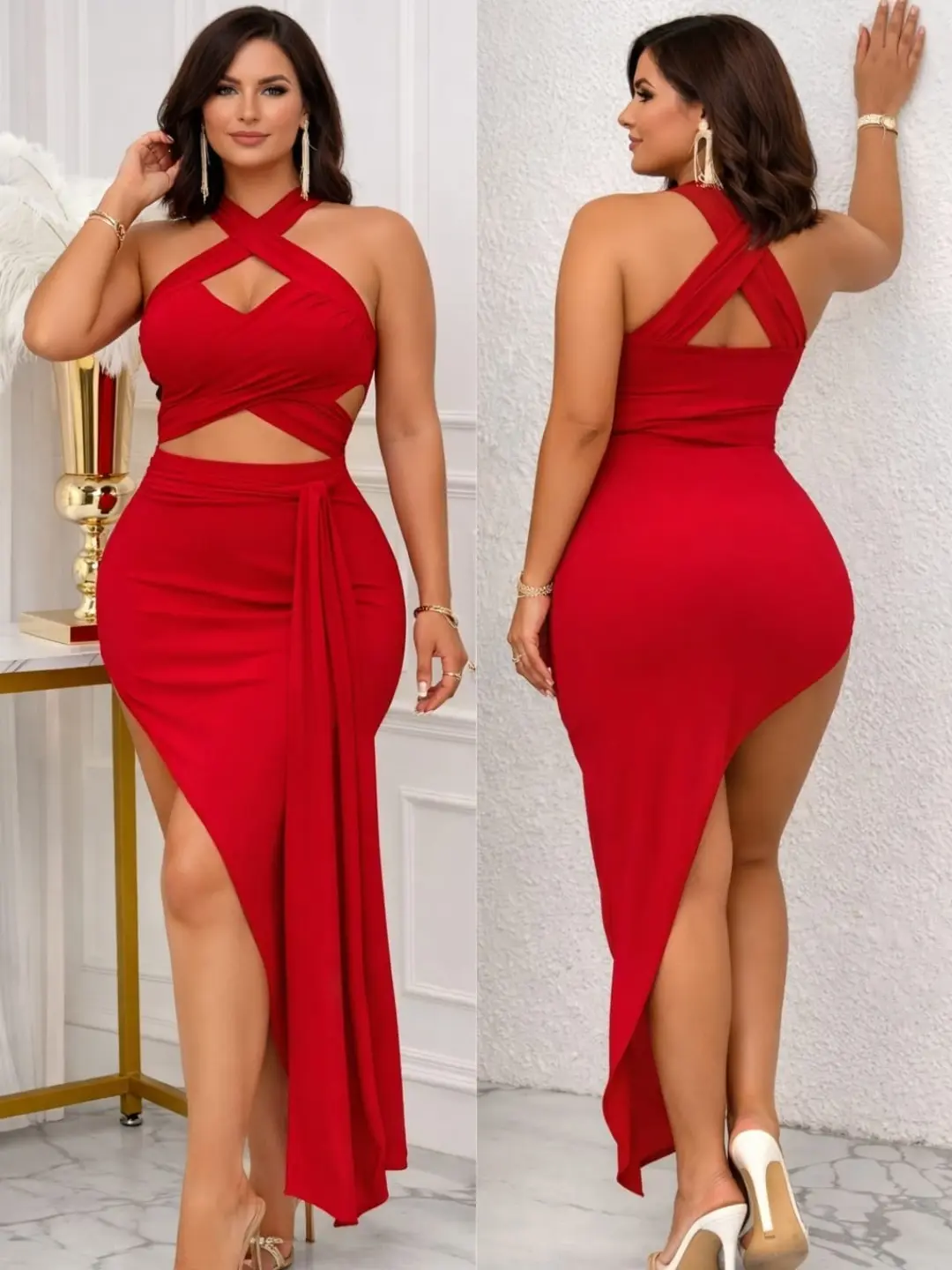 | Style | Halter Neck Cut-Out Asymmetrical Maxi Dress |