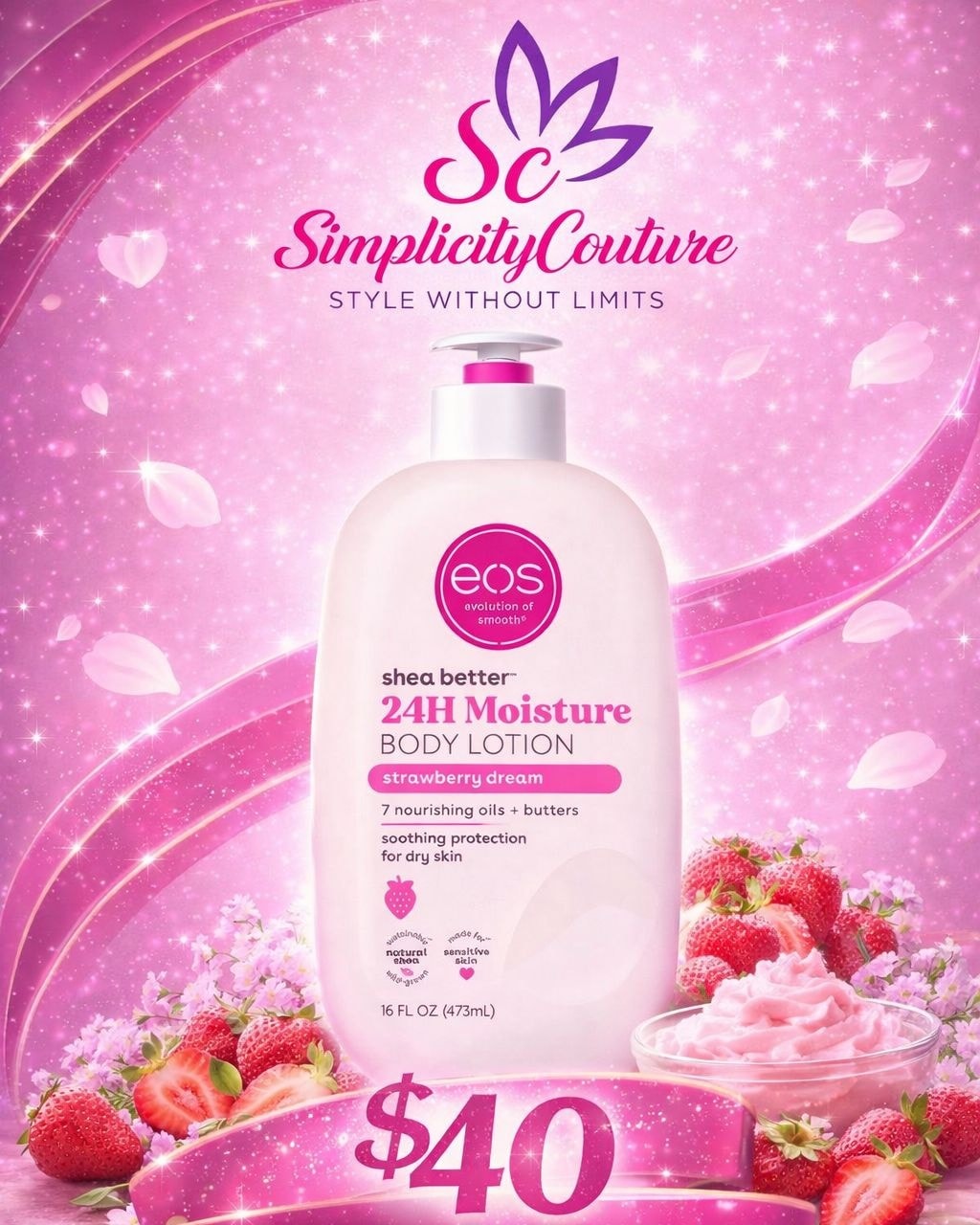 This is the EOS 24H Moisture Body Lotion in the Strawberry Dream scent. It is ultra-moisturizing with 7 nourishing oils and butters, providing soothing protection for dry skin. Made with natural shea and suitable for sensitive skin, this lotion offers long-lasting fragrance for an everyday glow. Available in a 16 fl oz (473ml) bottle.