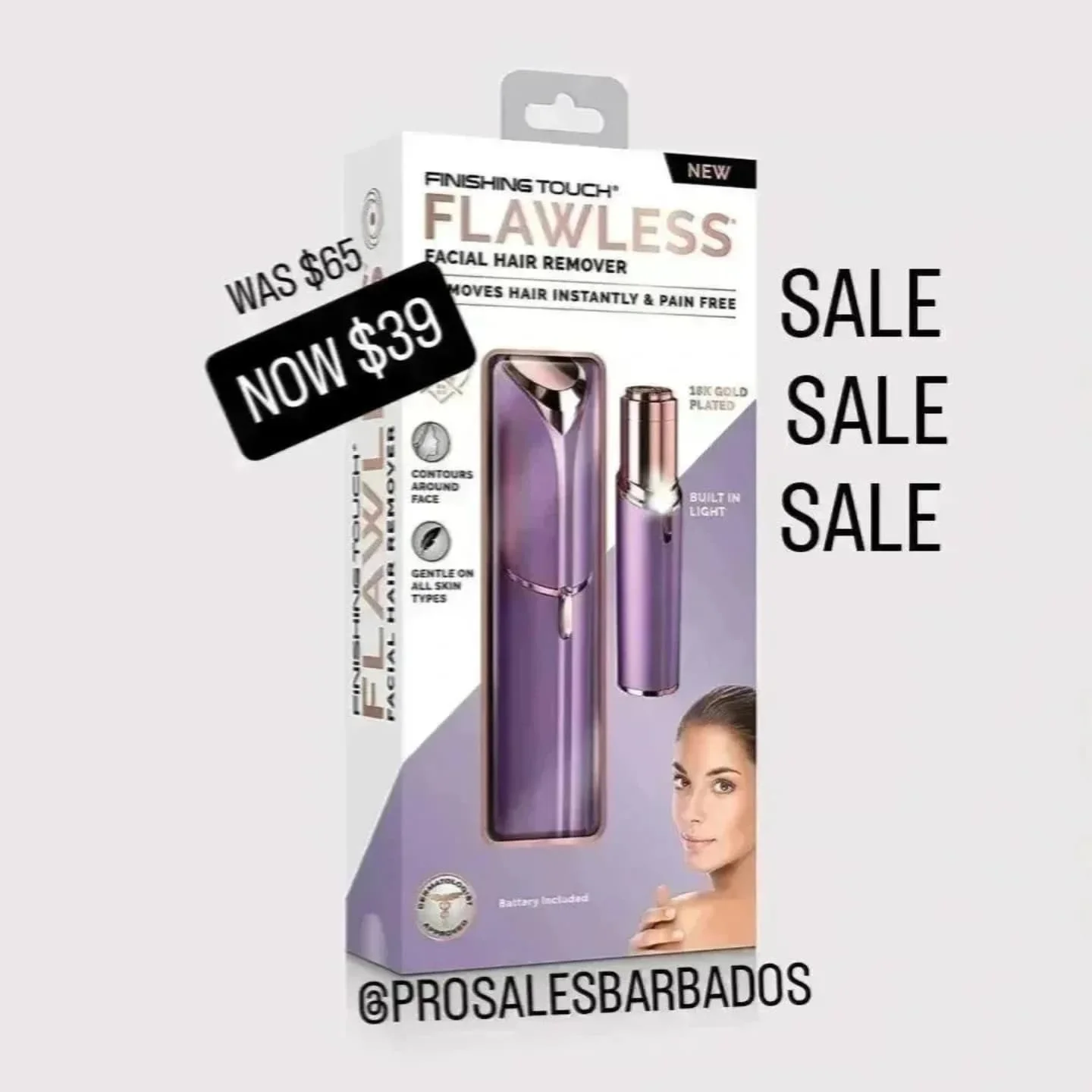 The Finishing Touch Flawless Facial Hair Remover is an 18K gold plated device designed to instantly and painlessly remove facial hair. It features a built-in light, contours around the face, and is gentle on all skin types. Dermatologist approved and includes battery.
