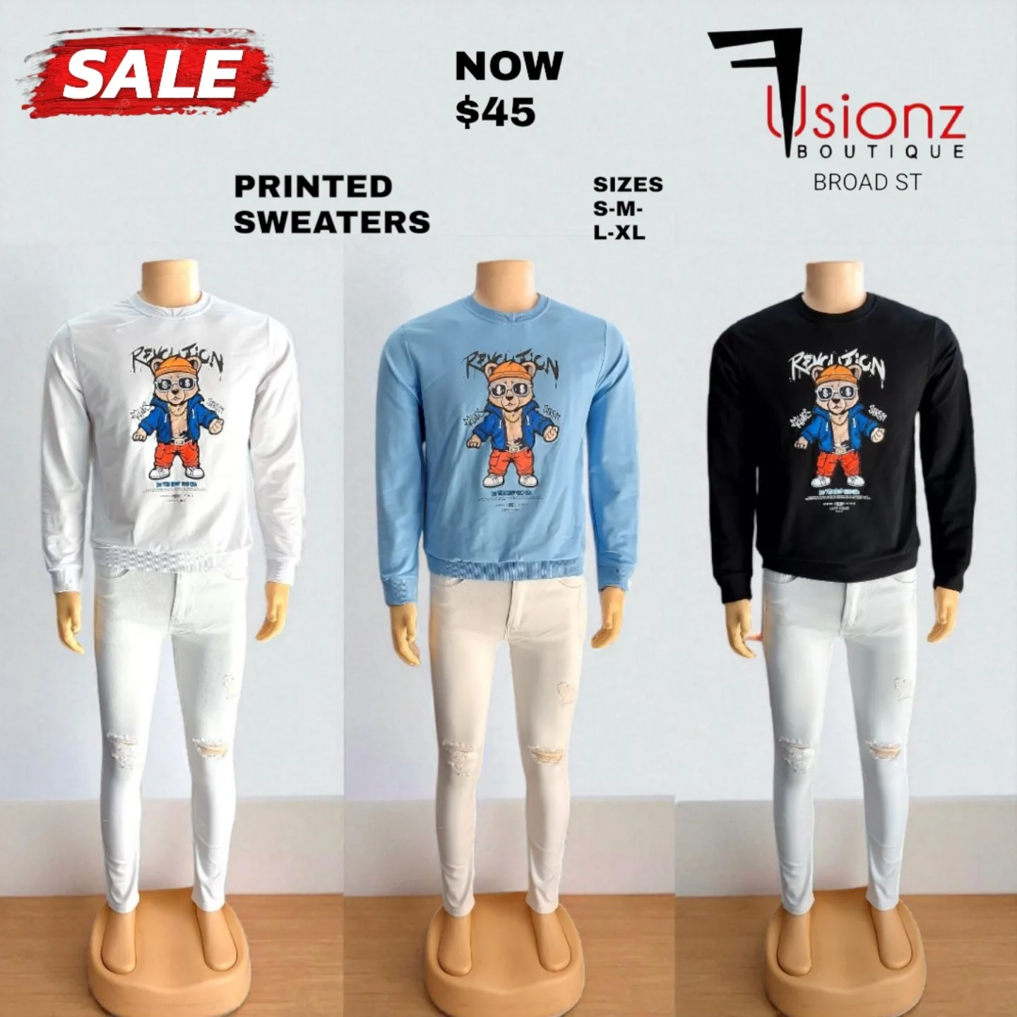 These Fusionz Boutique men’s printed sweaters feature a unique color-block design and a distinctive graphic print of a bear wearing sunglasses and a jacket. Available in multiple color combinations and sizes S-XL, these long-sleeve crewneck sweaters offer a casual and stylish look.