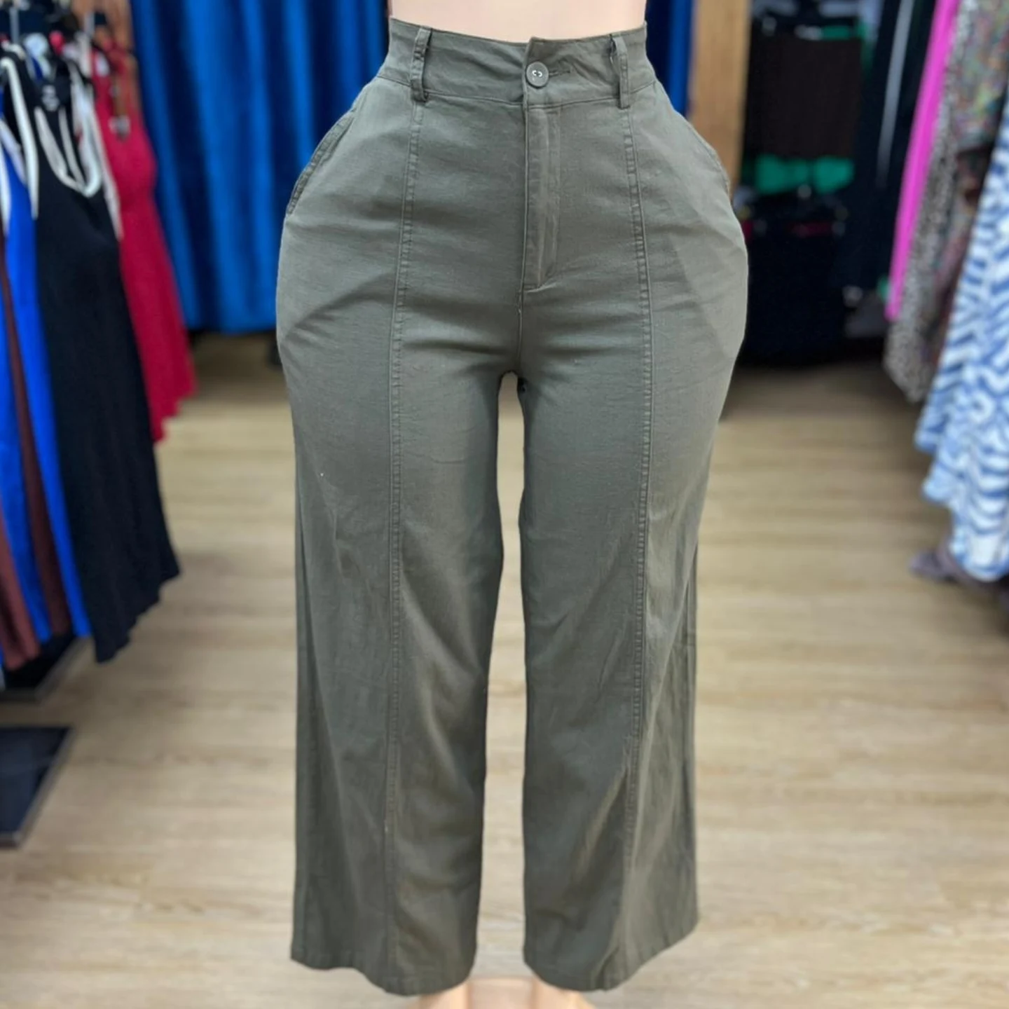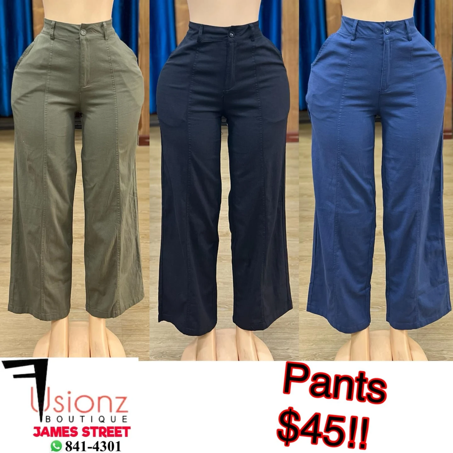 These Fusionz Boutique women’s high-waisted wide-leg pants feature a button and zipper closure with distinct seam details running down the front of each leg. Available in olive green, navy blue, and royal blue, these versatile pants offer a comfortable and stylish fit.