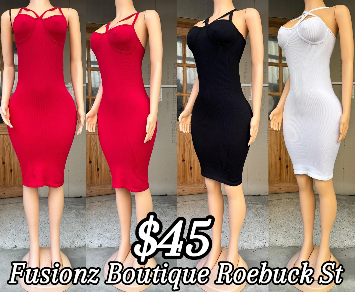 This bodycon dress from Fusionz Boutique features a ribbed texture with a sleeveless and form-fitting design. Available in two classic colors, black and white, it’s perfect for various occasions. The dress showcases a stylish strap detail at the neckline.