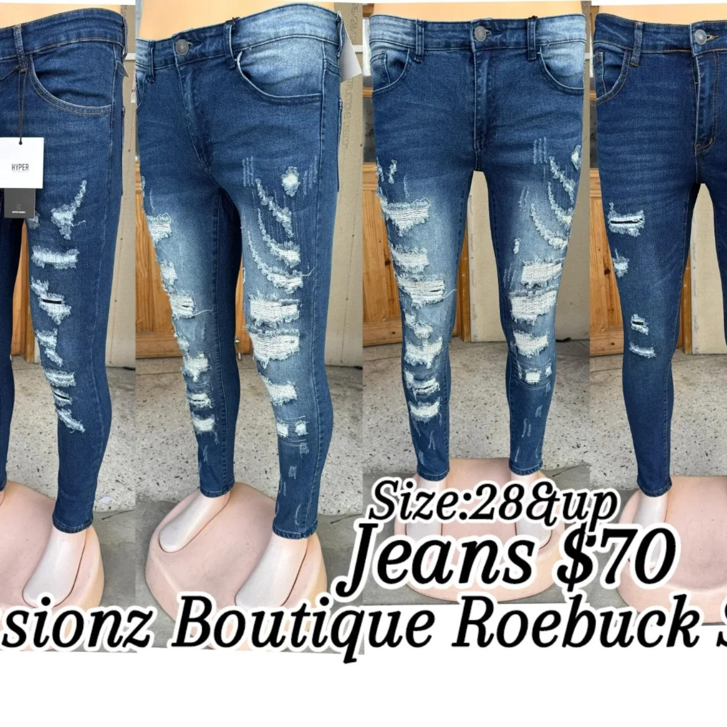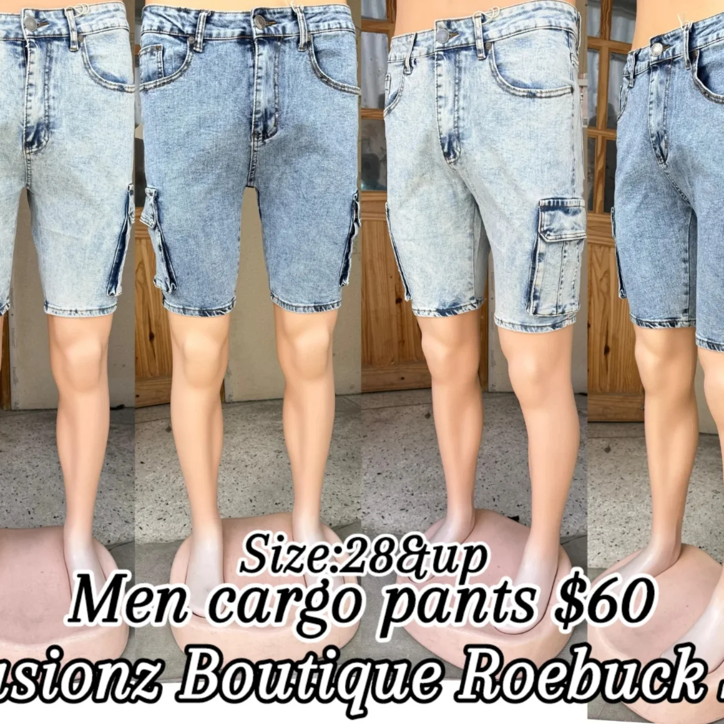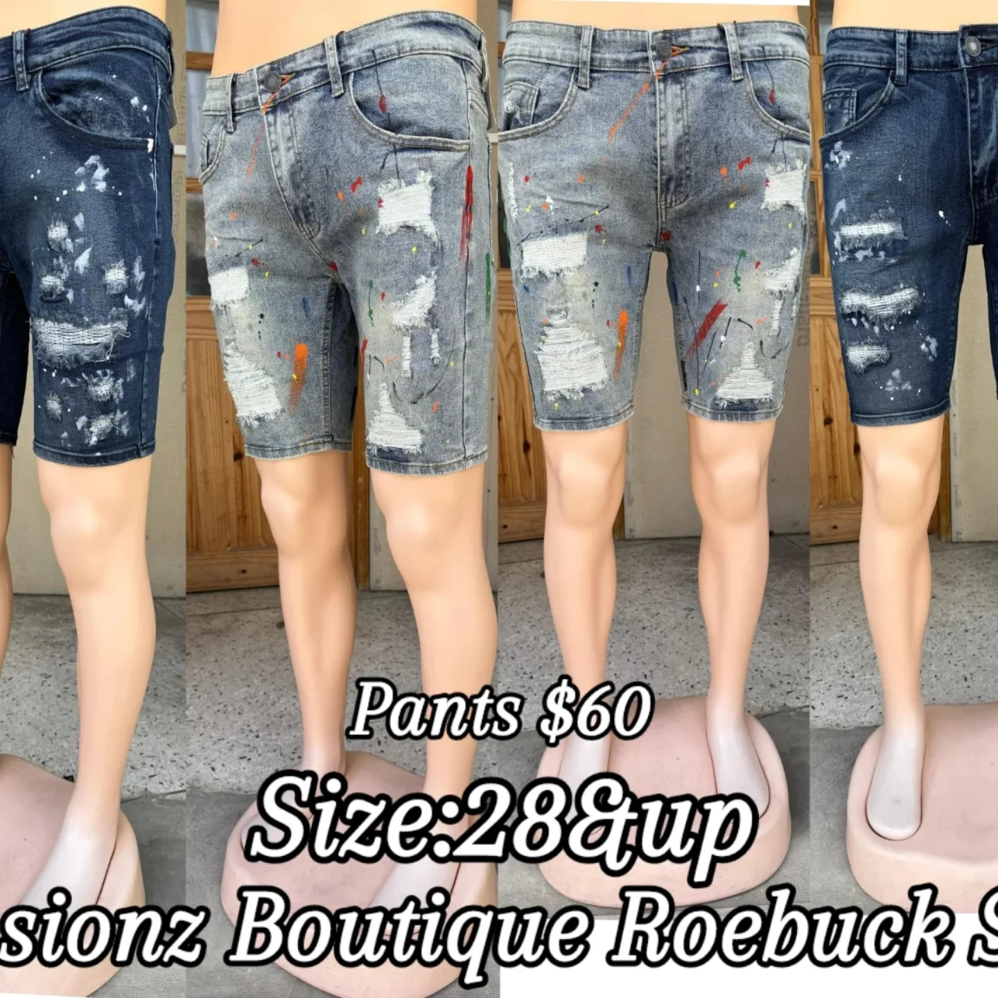 Men’s distressed shorts available in denim blue and gray. These shorts feature a rugged, ripped design with a knee-length fit. Perfect for a casual, edgy look.