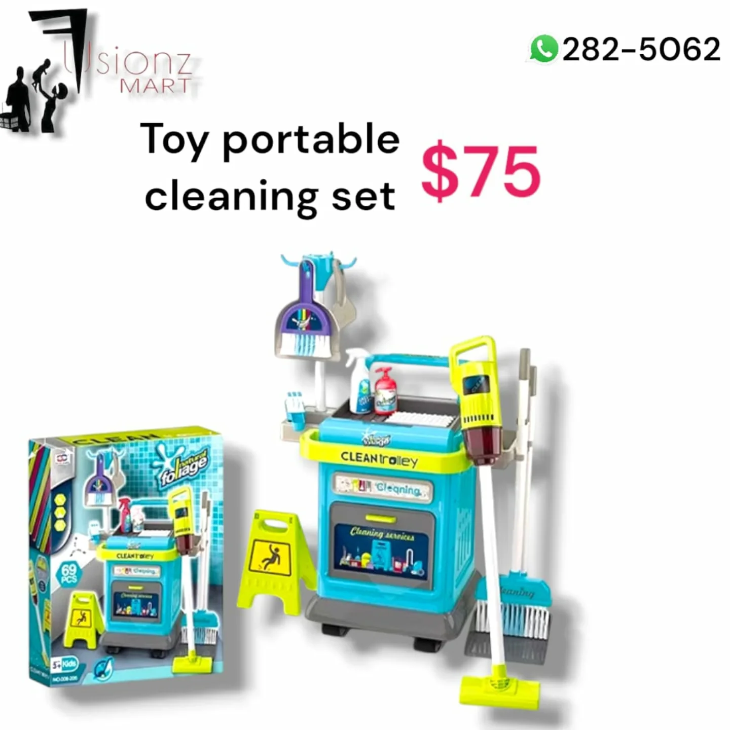 This FUSIONZ MART portable cleaning play set for kids features a vibrant blue and yellow trolley, complete with a toy vacuum cleaner, broom, dustpan, and various spray bottles. This 69-piece plastic set is designed for children aged 5 and up, encouraging imaginative role-play and helping them mimic household chores.