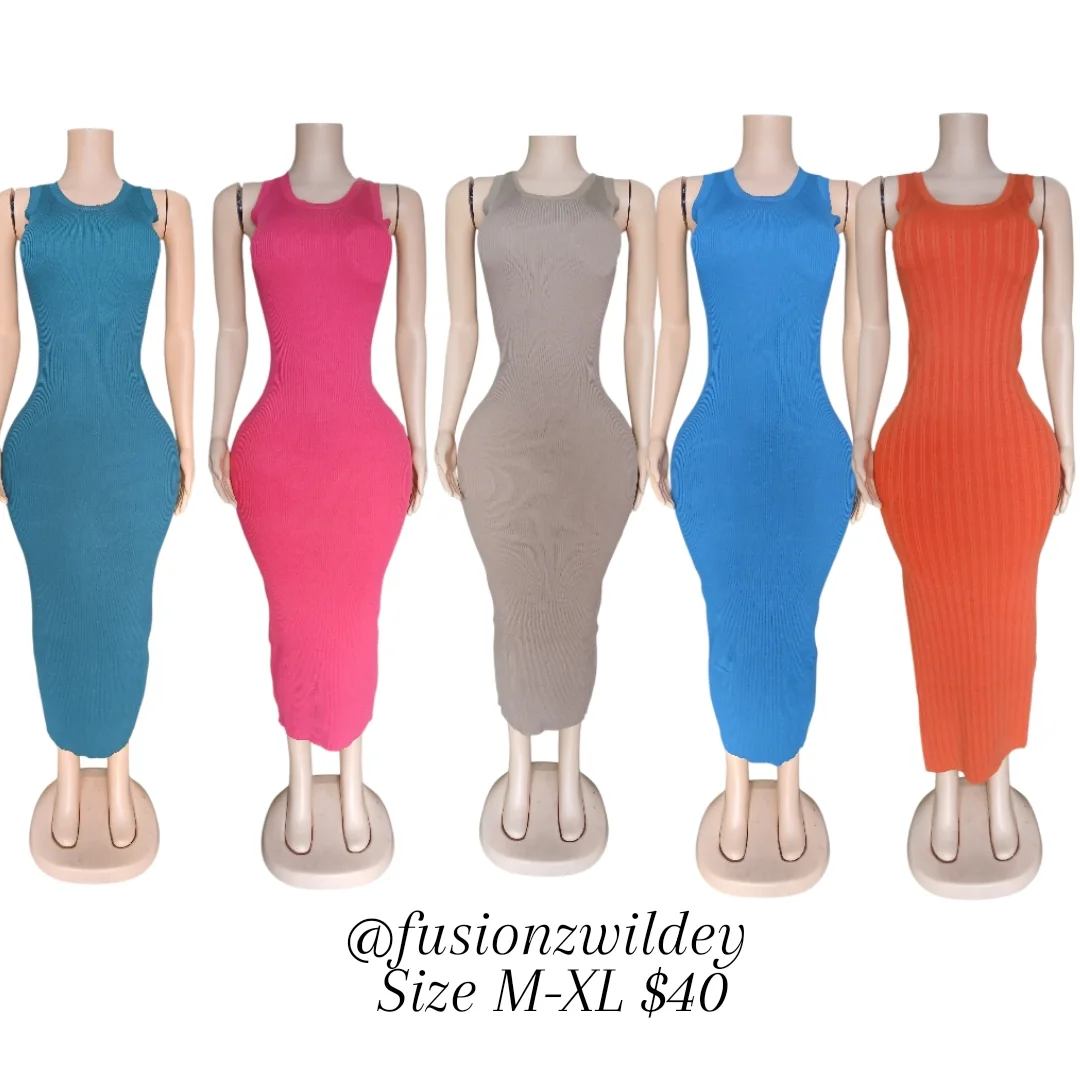 This form-fitting women’s ribbed knit maxi dress features a sleeveless design and a flattering bodycon silhouette. Available in a range of vibrant colors including Teal, Hot Pink, Beige, Bright Blue, and Orange, and offered in sizes M-XL.