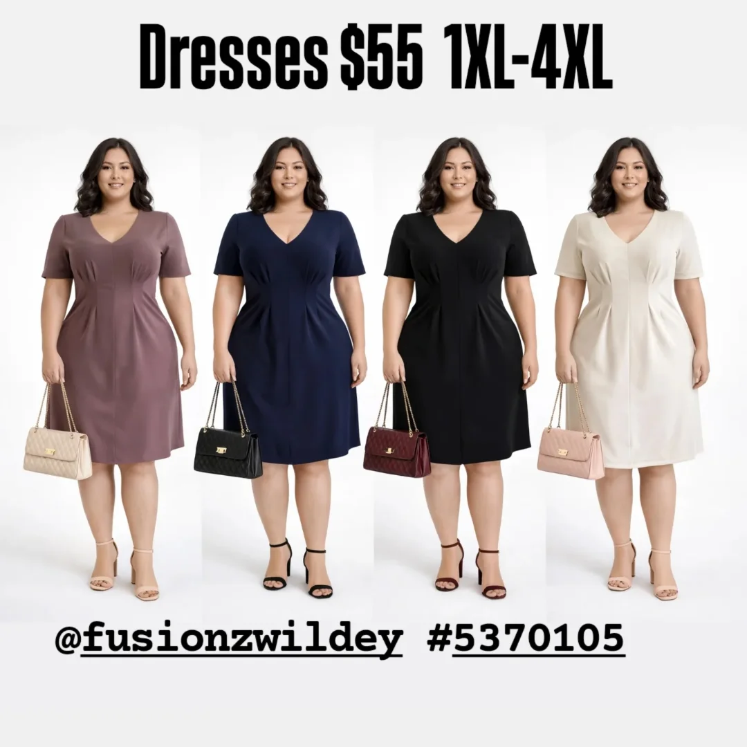 These elegant Fusionz women’s plus-size work dresses feature a flattering V-neckline and short sleeves, perfect for professional settings. Available in a variety of colors including mauve, navy blue, black, and beige, these knee-length dresses offer a comfortable and stylish fit. Sizes range from 1XL to 4XL.