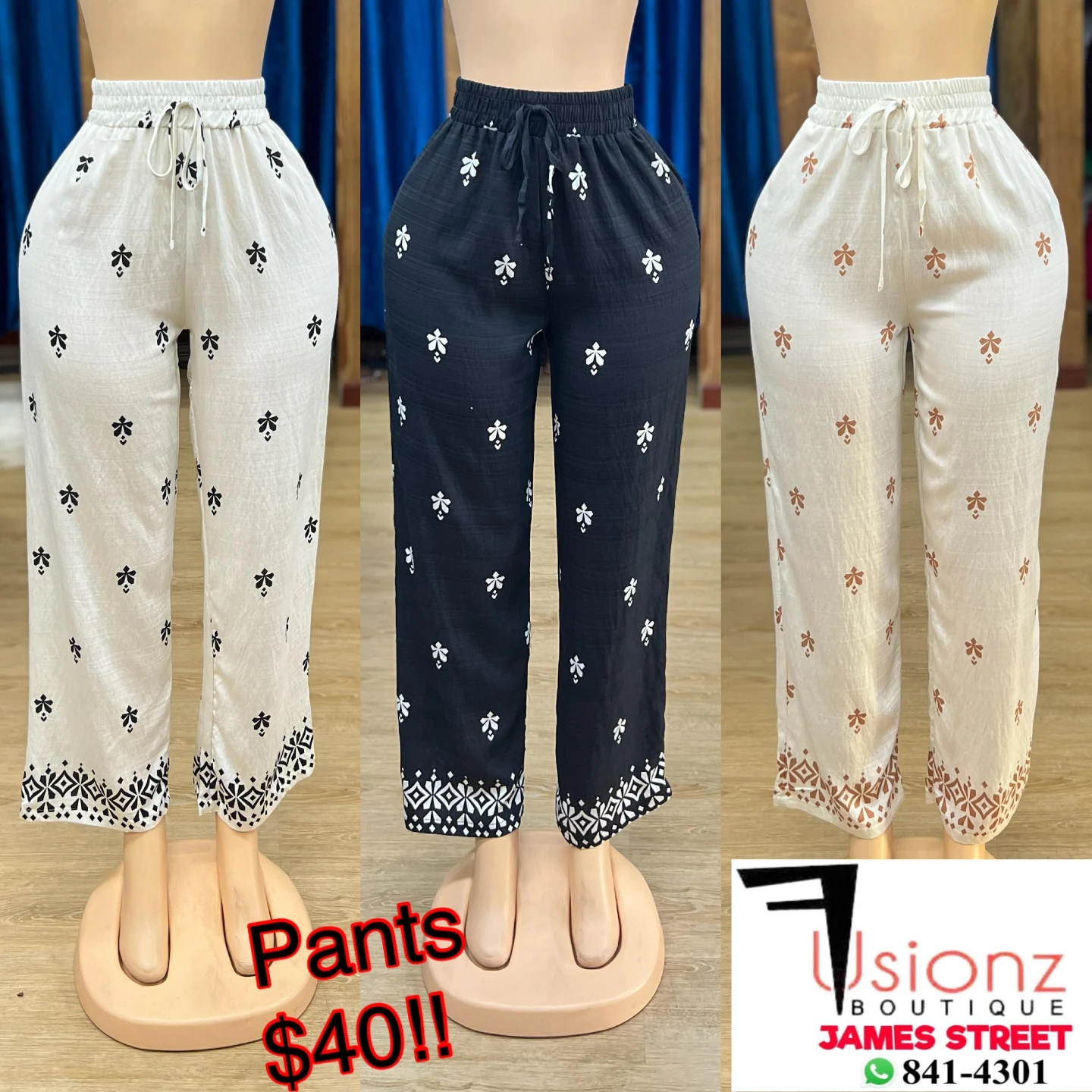 These stylish women’s pants from Fusionz feature a floral print and are available in beige, black, and white colors. They have an elastic waist with a drawstring for comfort. Perfect for casual outings or a relaxed day at home.