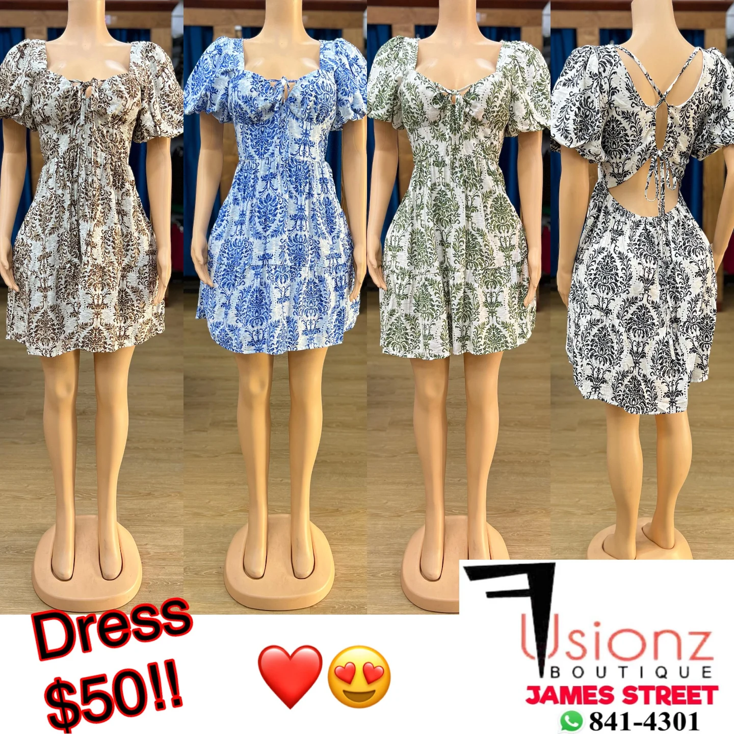 This women’s dress from Fusionz features a short-sleeve design with a delicate floral pattern. Available in four colors: brown, blue, green, and black. The dress has a flattering fit with a tie at the front and a back cut-out detail.