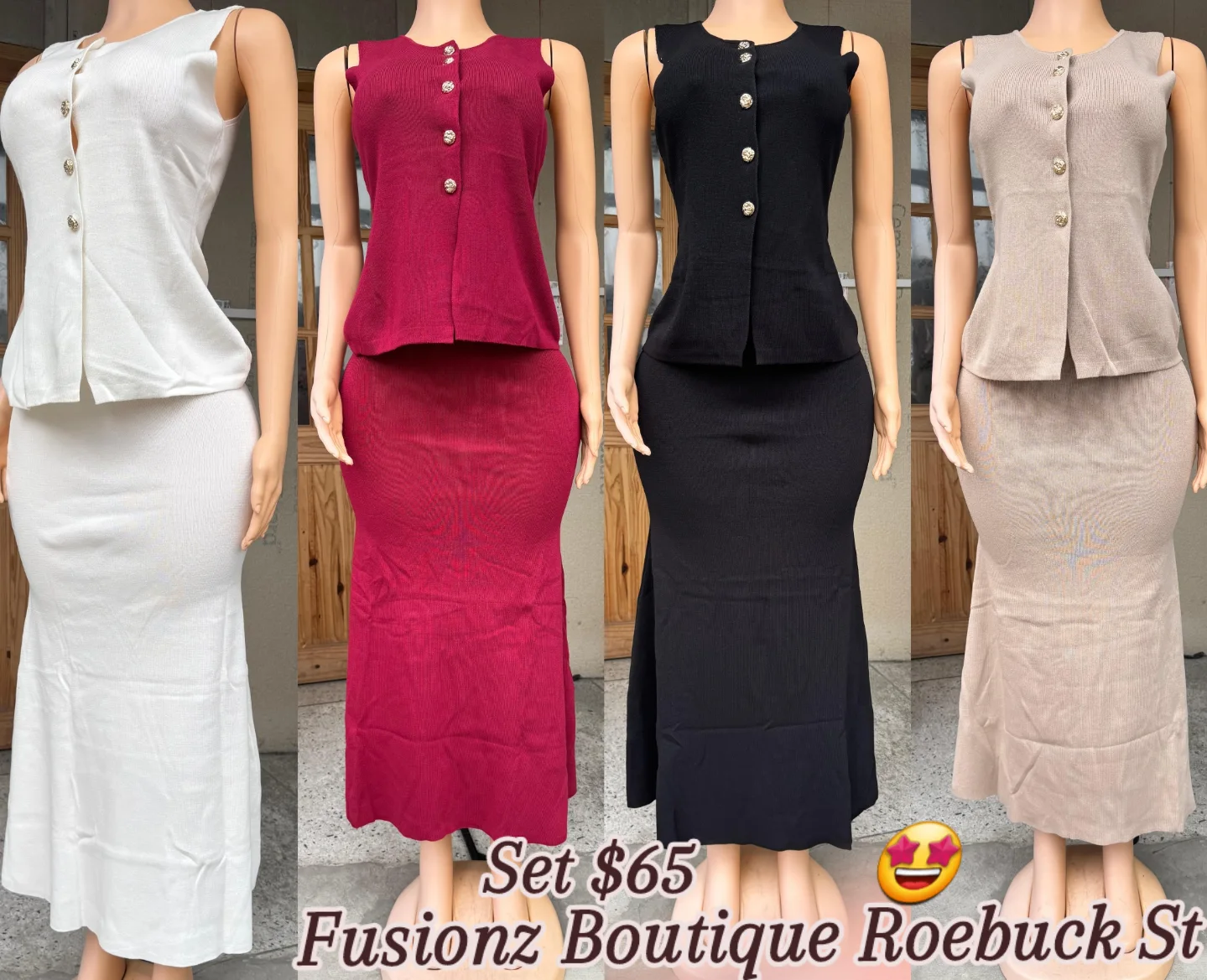 This sleeveless two-piece set from Fusionz features a buttoned top and a long skirt. Available in various colors including red, white, black, and beige, this set is perfect for casual outings. The ribbed texture adds a stylish touch to the ensemble.