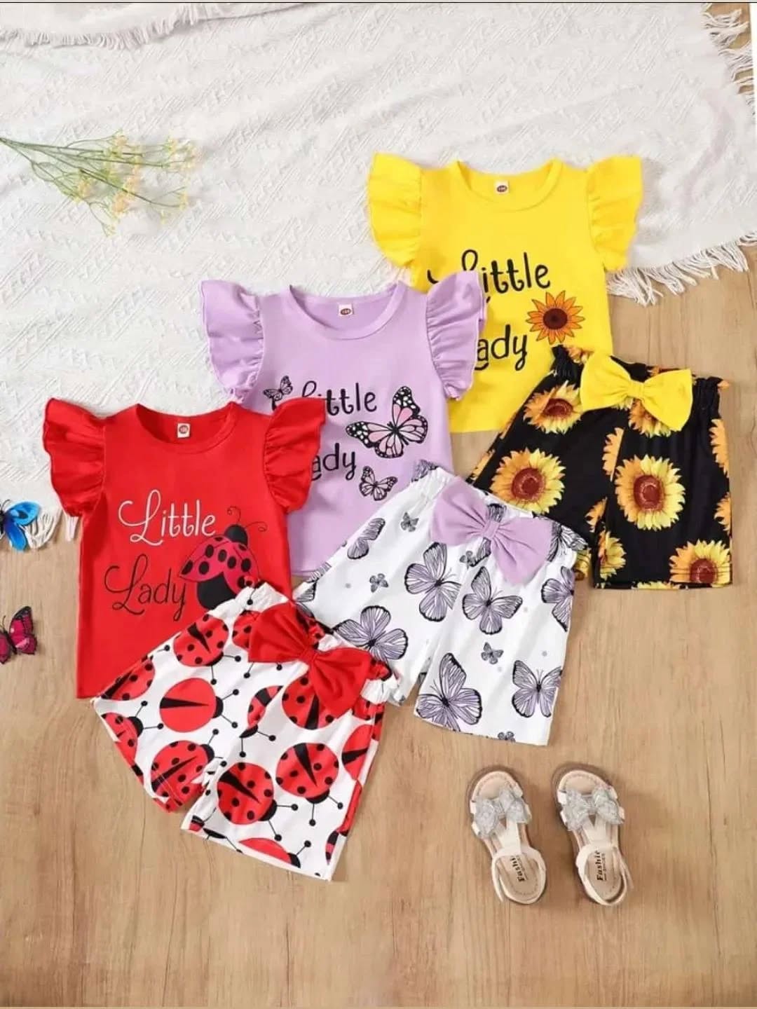 This girls’ casual set features playful designs with ‘Little Lady’ printed tops and matching shorts. The set comes in vibrant colors like red, yellow, and purple, with patterns such as ladybugs, butterflies, and sunflowers. Available in sizes for ages 3-4 and 7-8.