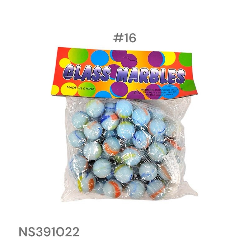 A bag of glass marbles with various swirling colors including blue, orange, and yellow. These marbles are suitable for play and collection. Warning: Choking hazard, not for children under 3 years.