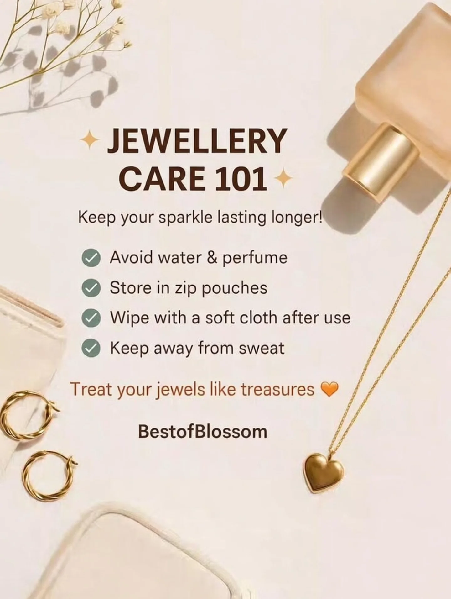 This set includes a gold heart pendant necklace and twisted hoop earrings. The jewelry is gold-toned and designed to be cherished. Care instructions are provided to help maintain its sparkle, advising to avoid water and perfume, store in zip pouches, wipe with a soft cloth, and keep away from sweat.