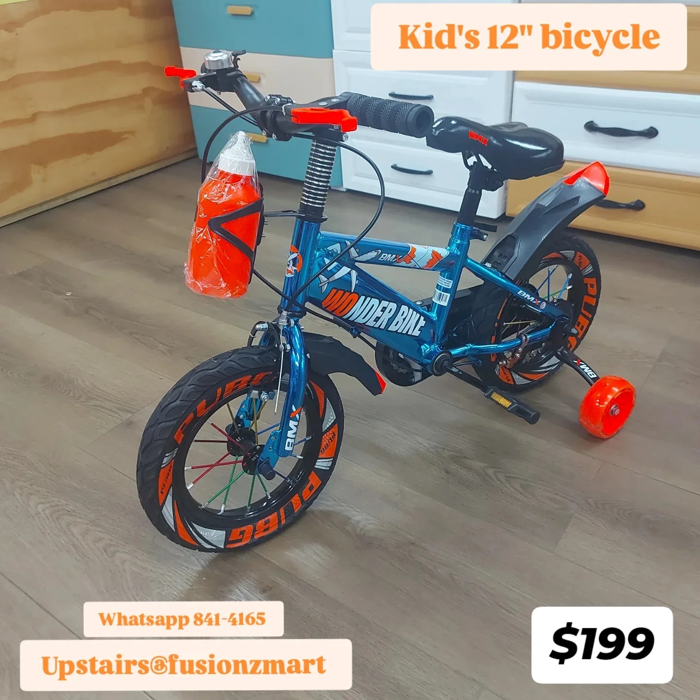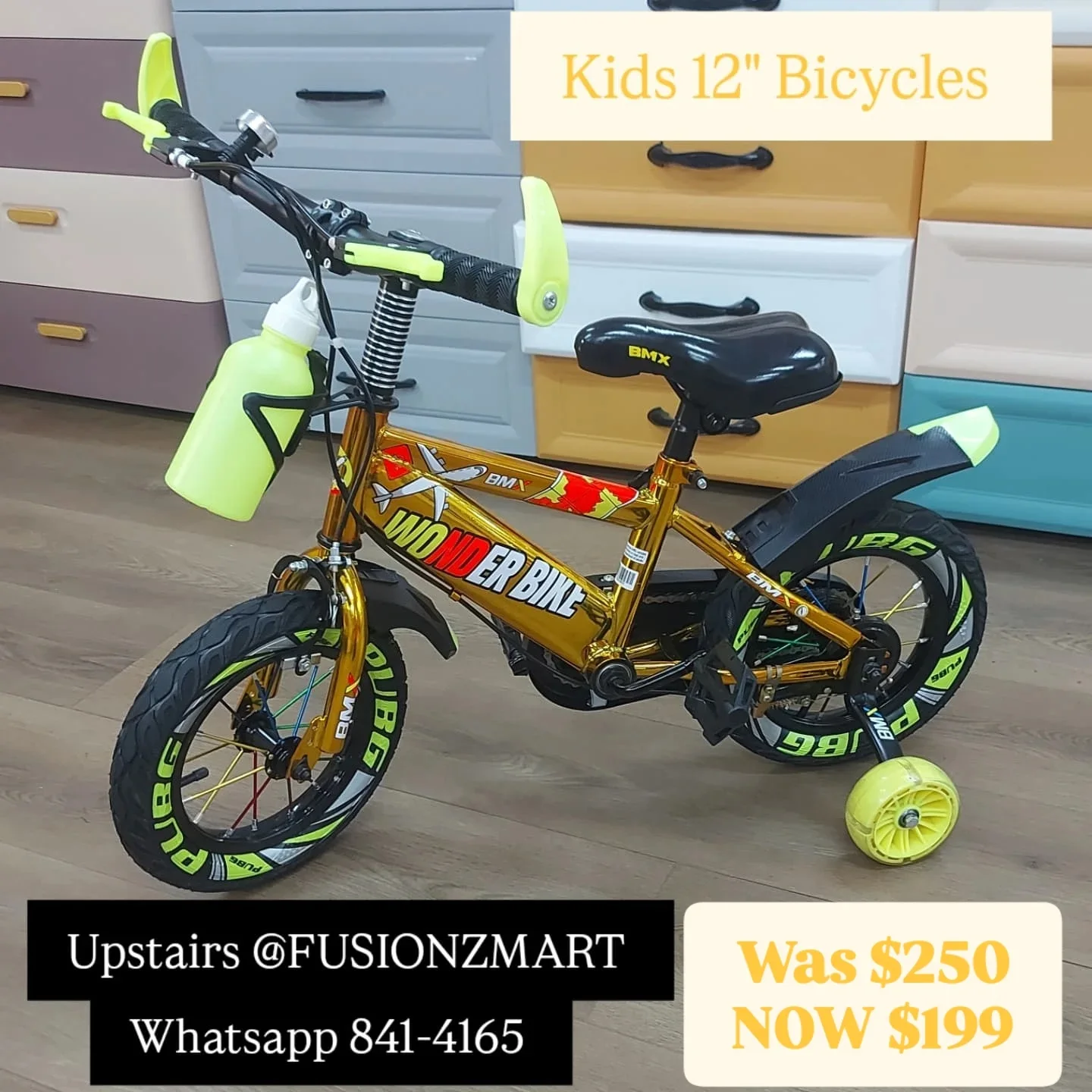 This is a gold 12-inch kids BMX bicycle with training wheels and a water bottle. It features a “Wonder Bike” design and is suitable for children. Available for purchase at Fusionzmart.