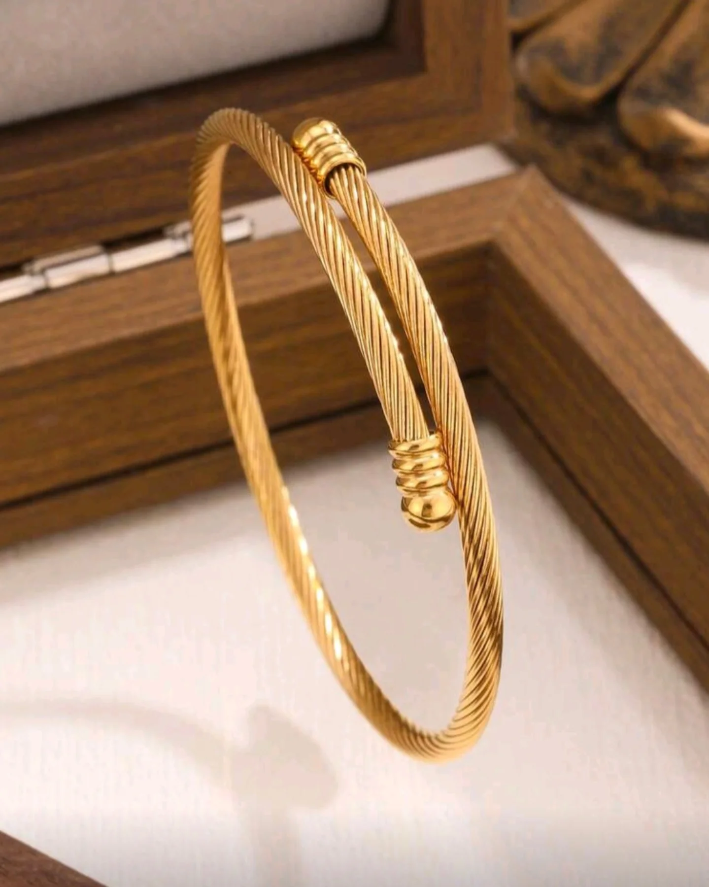 This is a three-piece bangle set made of stainless steel. The set includes a twisted cable bangle, a nail-shaped bangle with a clover detail, and a smooth bangle adorned with clover-shaped charms. Available in gold.