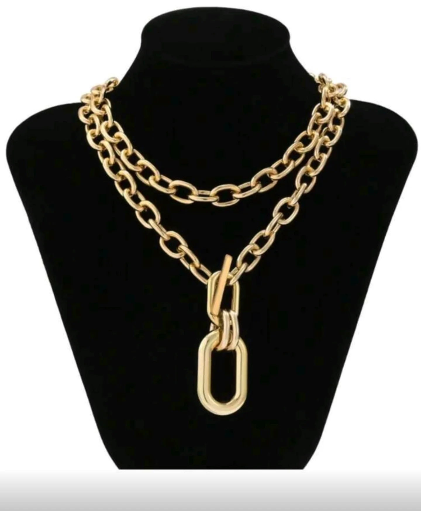 This gold-toned layered chain necklace features two distinct chains, one shorter and one longer, connected by a prominent oval link pendant and a stylish toggle clasp. It is a fashion accessory designed to make a statement, and the caption specifies it is not made of stainless steel.