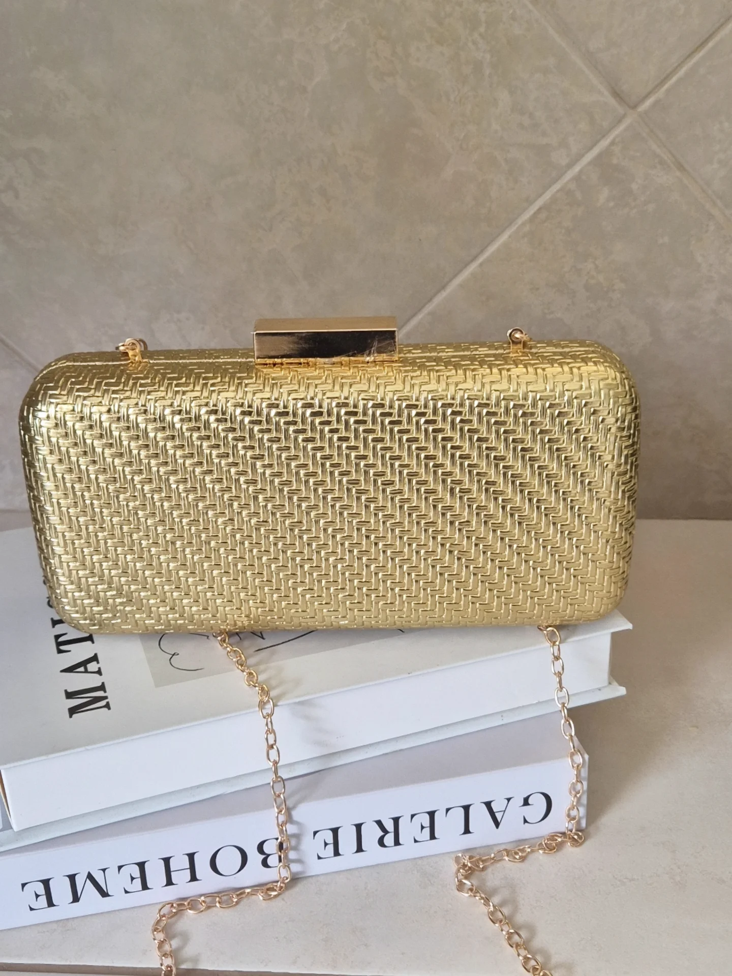 Elegant gold clutch bag featuring a distinct woven texture and a long, detachable gold chain strap. This versatile accessory is perfect for evening events or adding a touch of sophistication to any outfit.