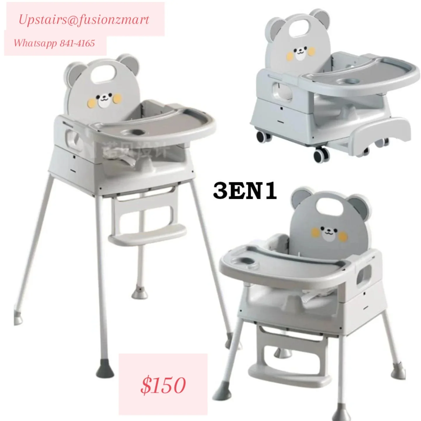 This is a gray and white kids feeding chair with a removable tray. It is waterproof and easy to wipe clean. The tray is adjustable to three speeds. This chair is ideal for feeding babies and toddlers.