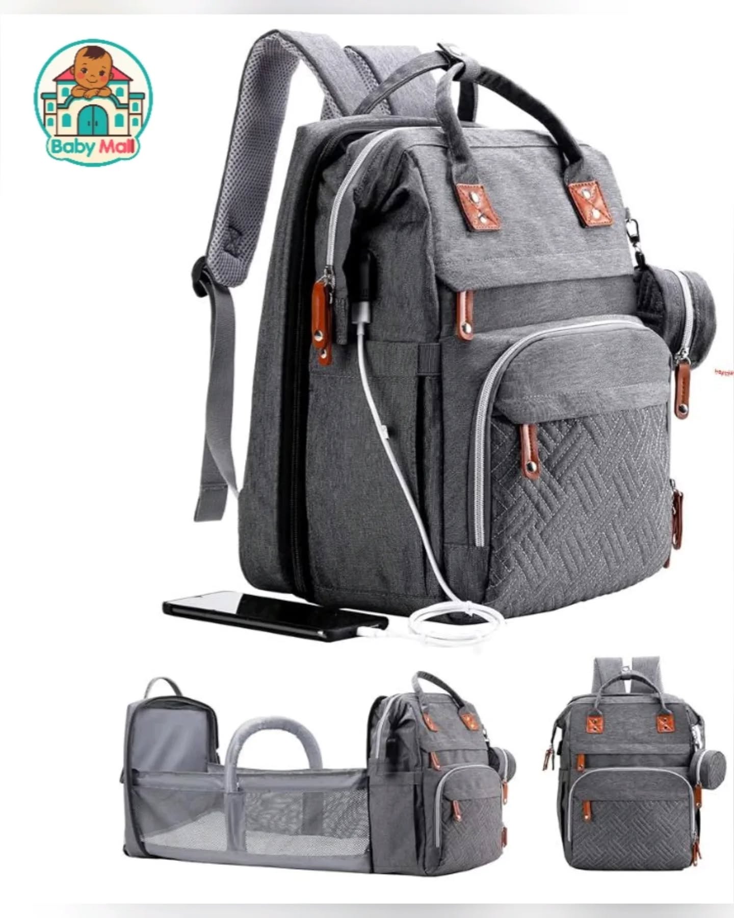 This is a gray diaper bag backpack with a built-in changing station, offering a safe and easy way to change diapers anywhere. It features a water-resistant exterior and interior, a 25L main compartment for extra large capacity, three insulated bottle pockets, and a waterproof pocket. The backpack is designed for comfortable carrying with cushioned straps and a padded back, and includes a USB port for on-the-go charging. This diaper bag is ideal for new moms, dads, and travel.