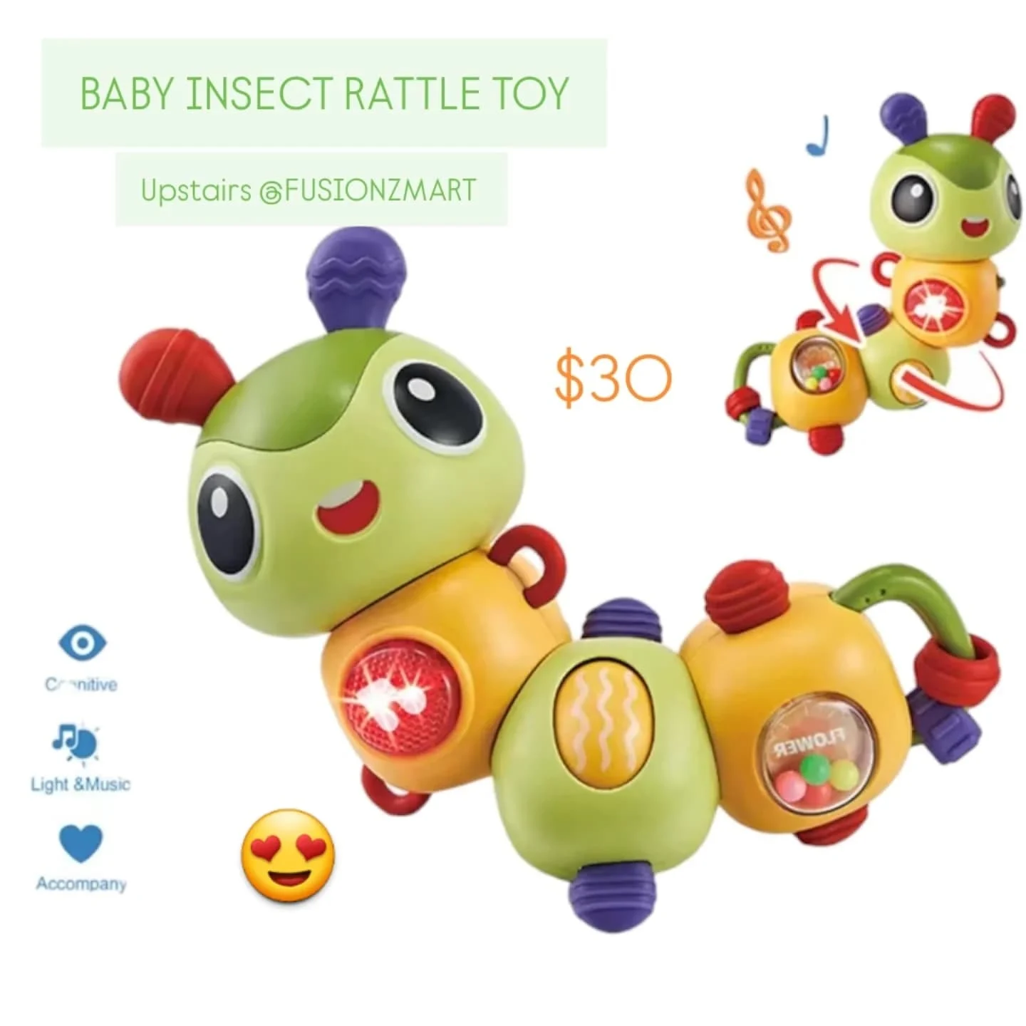 This playful baby rattle toy features a colorful insect design equipped with light and sound effects. It’s designed to stimulate the visual and auditory senses of infants, ensuring both entertainment and safety for children aged 12 months and older.