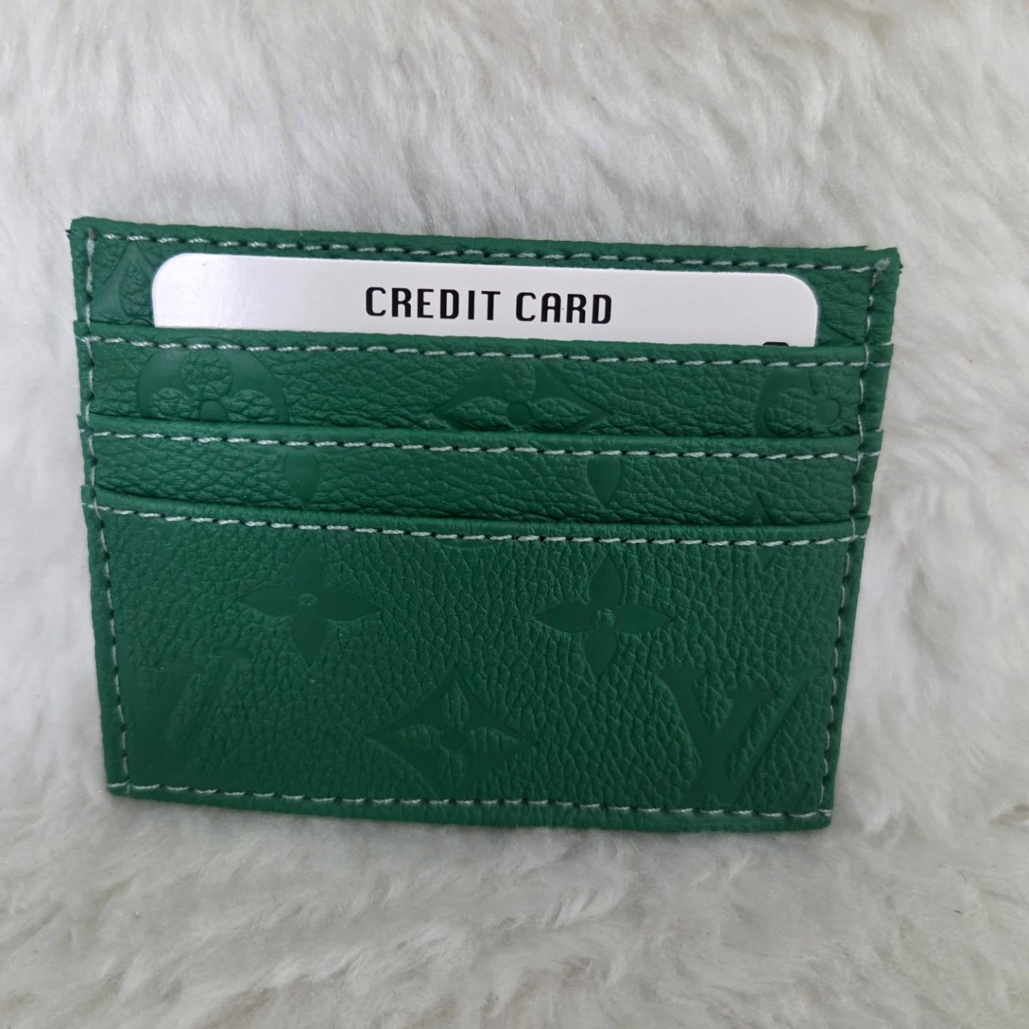 This is a green card holder with multiple slots, ideal for securely holding credit cards. The surface seems textured with an embossed pattern for added style.