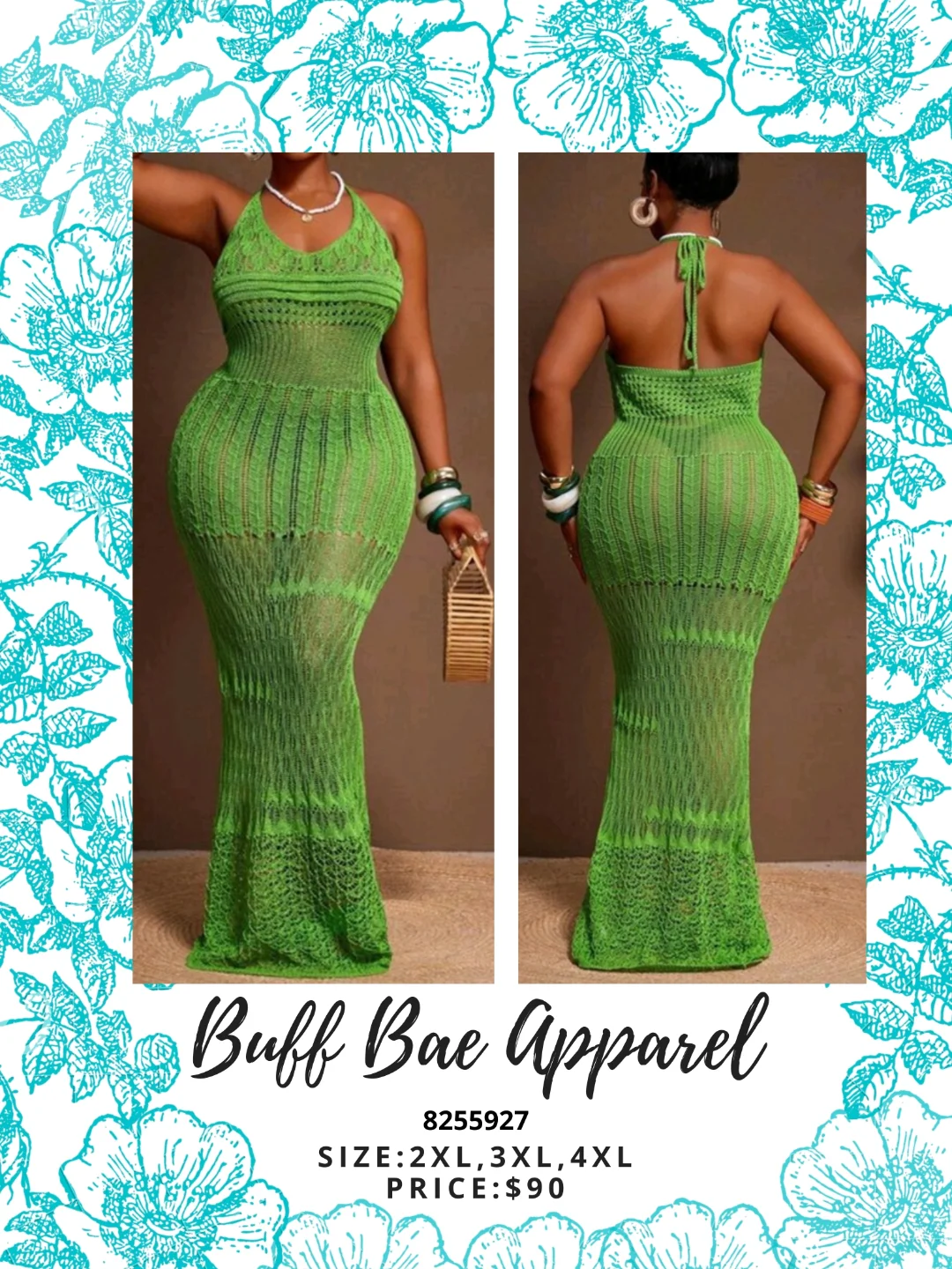 This is a green, crochet halter maxi dress. It features a sheer, open-knit design and a floor-length silhouette. Available in sizes 2XL, 3XL, and 4XL.