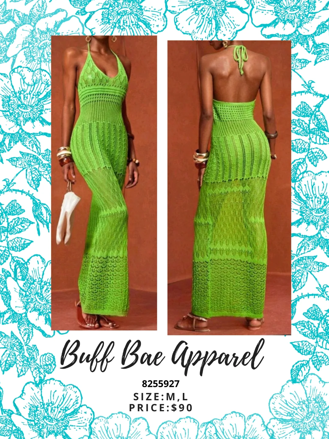 This is a sheer, crochet knit halter maxi dress in a vibrant green color. It features a flattering fit and a long, flowing silhouette, perfect for a beach cover-up or a stylish evening out. Available in sizes M and L.