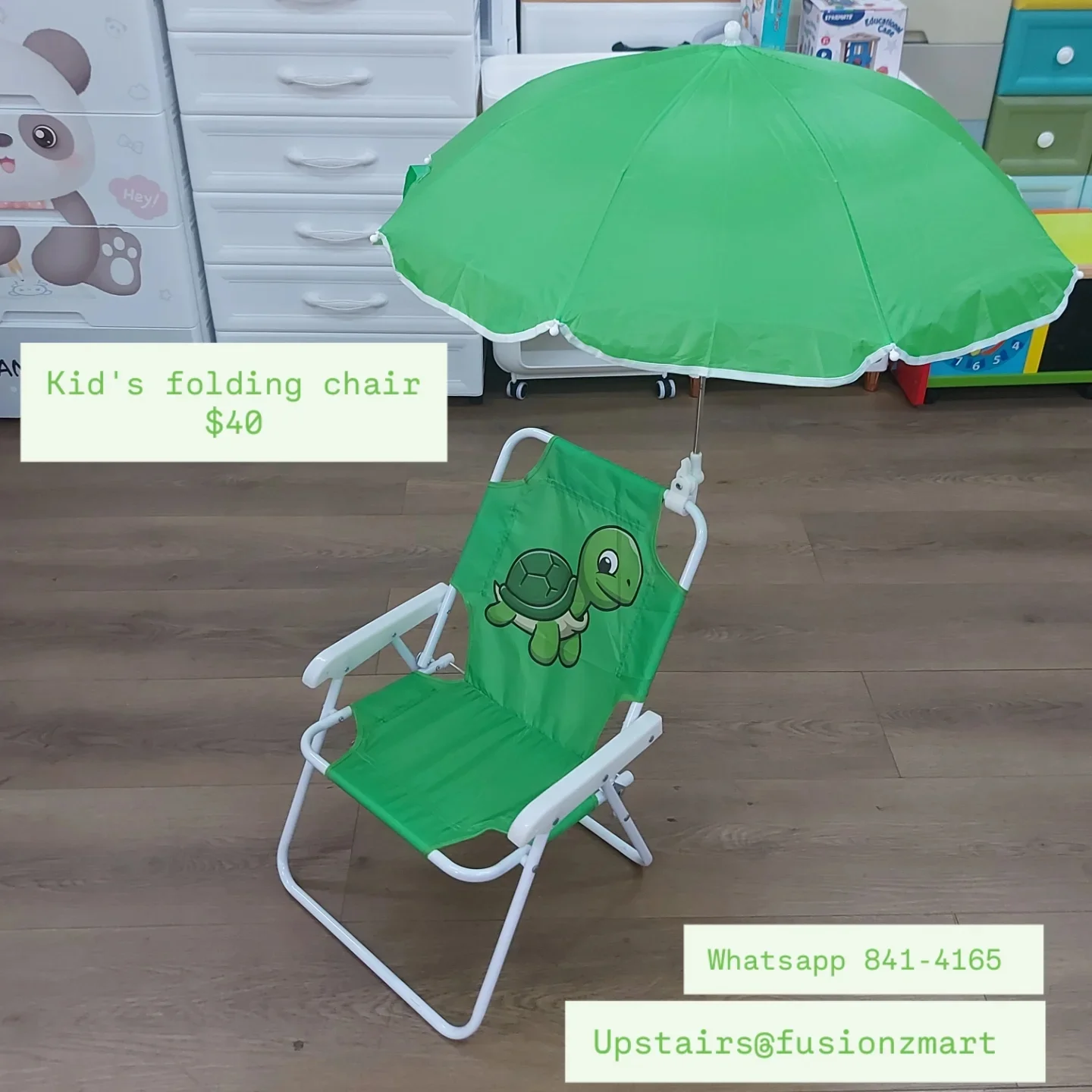 A convenient and portable folding chair designed for kids, featuring a cute turtle print, a cup holder, and a durable frame. The chair includes an attached green umbrella for added sun protection. Available in multiple colors including red, green, black, and royal blue.