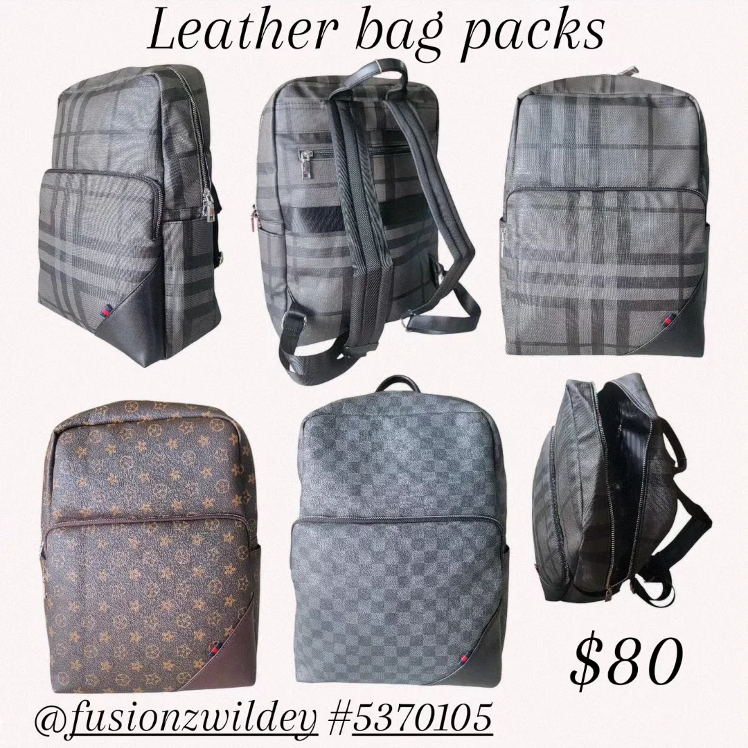 A collection of stylish leather backpacks featuring various designs including classic grey plaid, elegant brown monogram, and modern grey checkered patterns. These versatile bags are suitable for everyday use, travel, or school.