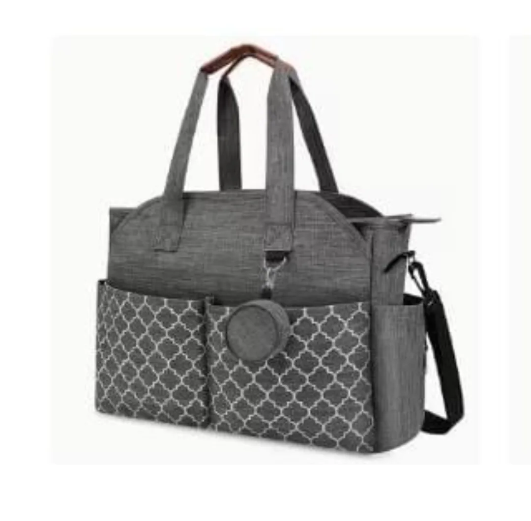 This versatile grey multi-compartment tote bag features a distinctive white geometric pattern on its front pockets, offering both style and ample storage. Designed with sturdy top handles and an adjustable shoulder strap, it’s ideal for carrying essentials, making it a practical choice as a women’s everyday bag or a spacious diaper bag.