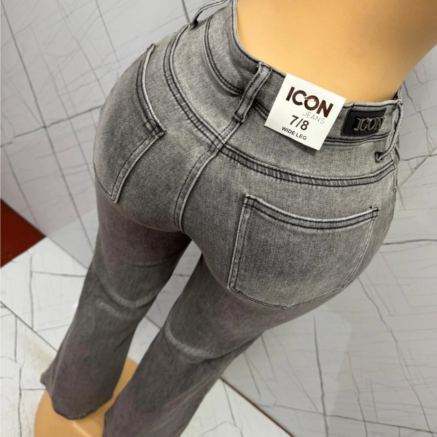 These grey ICON wide-leg jeans for women feature a washed denim look and a comfortable fit. The jeans are available in size 7/8 and are designed with a flattering wide-leg silhouette, perfect for a casual yet stylish outfit.