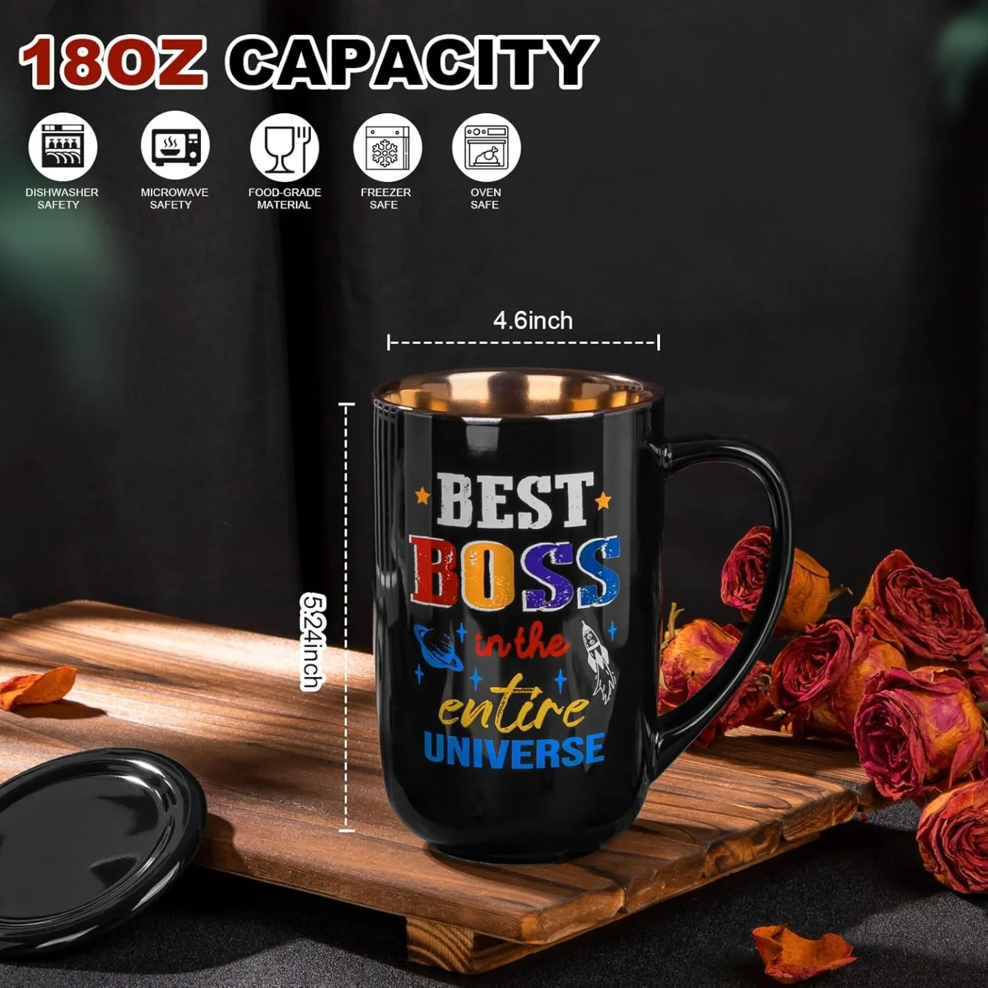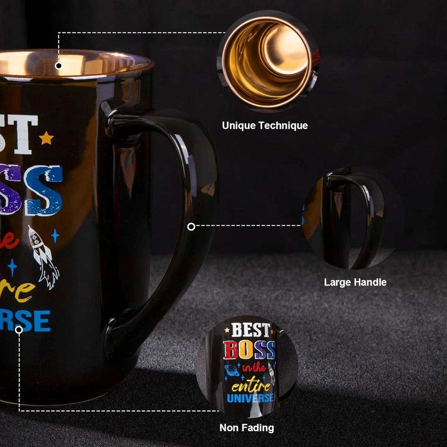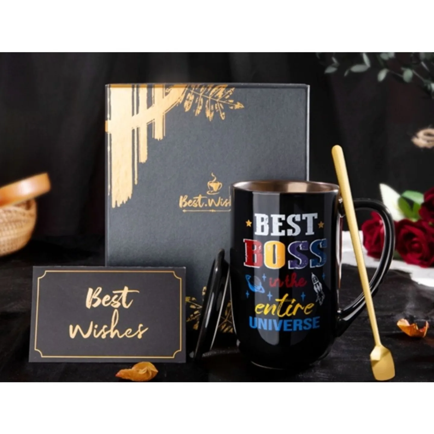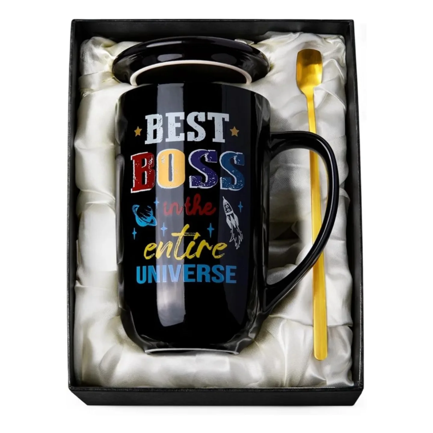This Heartening Gifts ‘Best Boss In The Entire Universe’ gift set features a large capacity 18oz black ceramic mug with a bronze interior, a matching lid, and a gold stainless steel espresso spoon. Beautifully presented in a gift box, it makes an ideal appreciation or thank you gift for any boss.