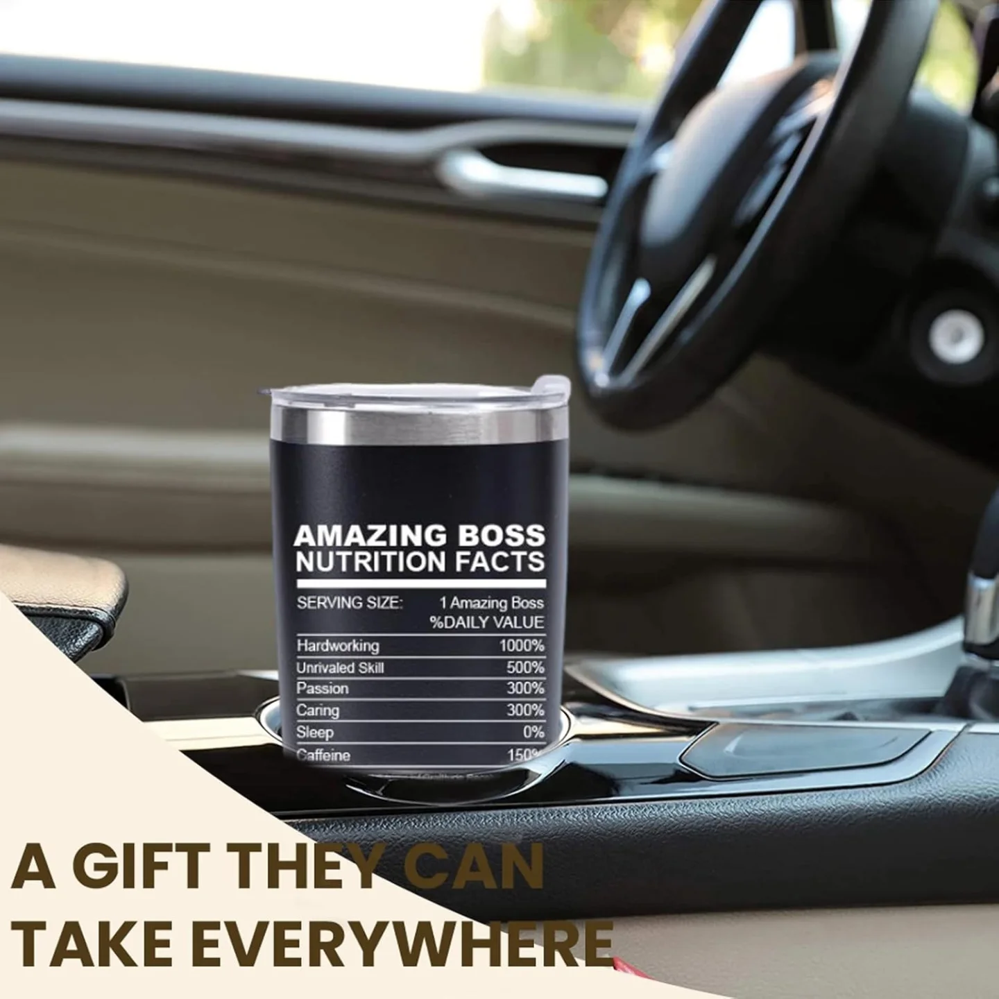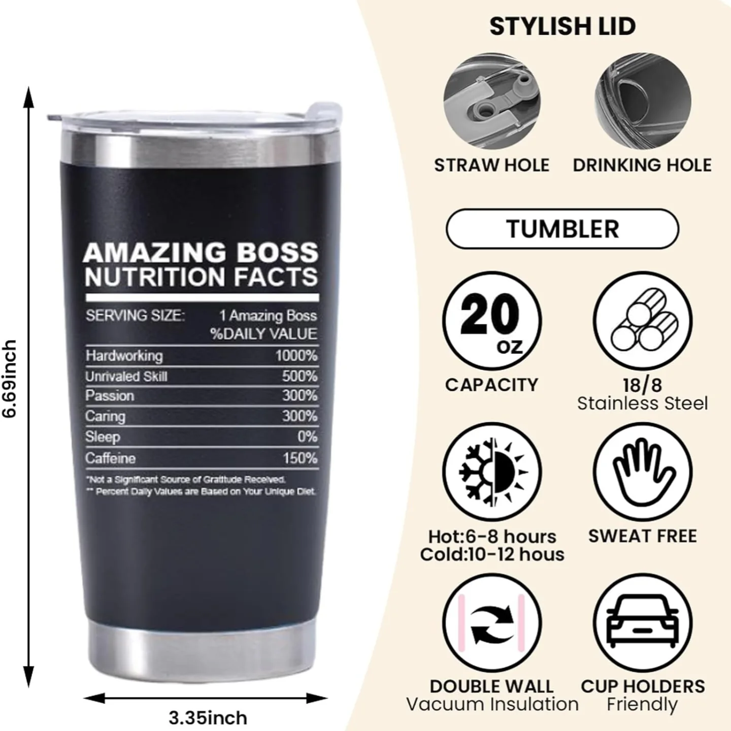 This black double-wall vacuum insulated stainless steel travel tumbler is designed as a perfect boss appreciation gift. It features unique “A Truly Amazing Boss” and “Amazing Boss Nutrition Facts” text, keeping beverages hot or cold. This 20oz tumbler is ideal for daily use at the office or on the go, making it a thoughtful thank you gift for any boss.