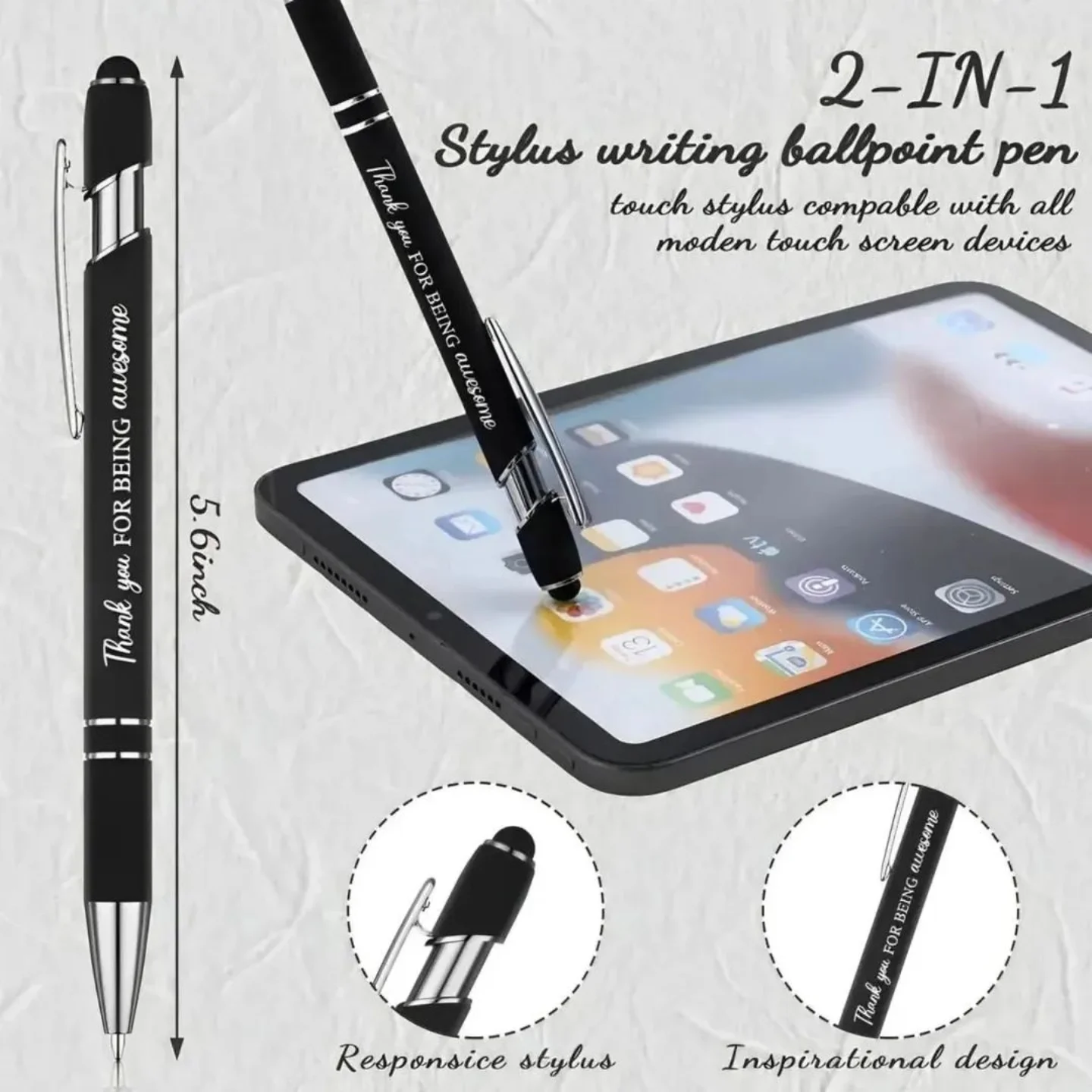 An elegant black and silver gift pen featuring a stylus tip and engraved with the message ‘Thank You For Being Awesome’. This versatile pen is a perfect token of appreciation for any occasion.